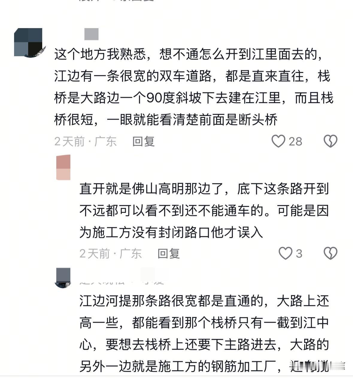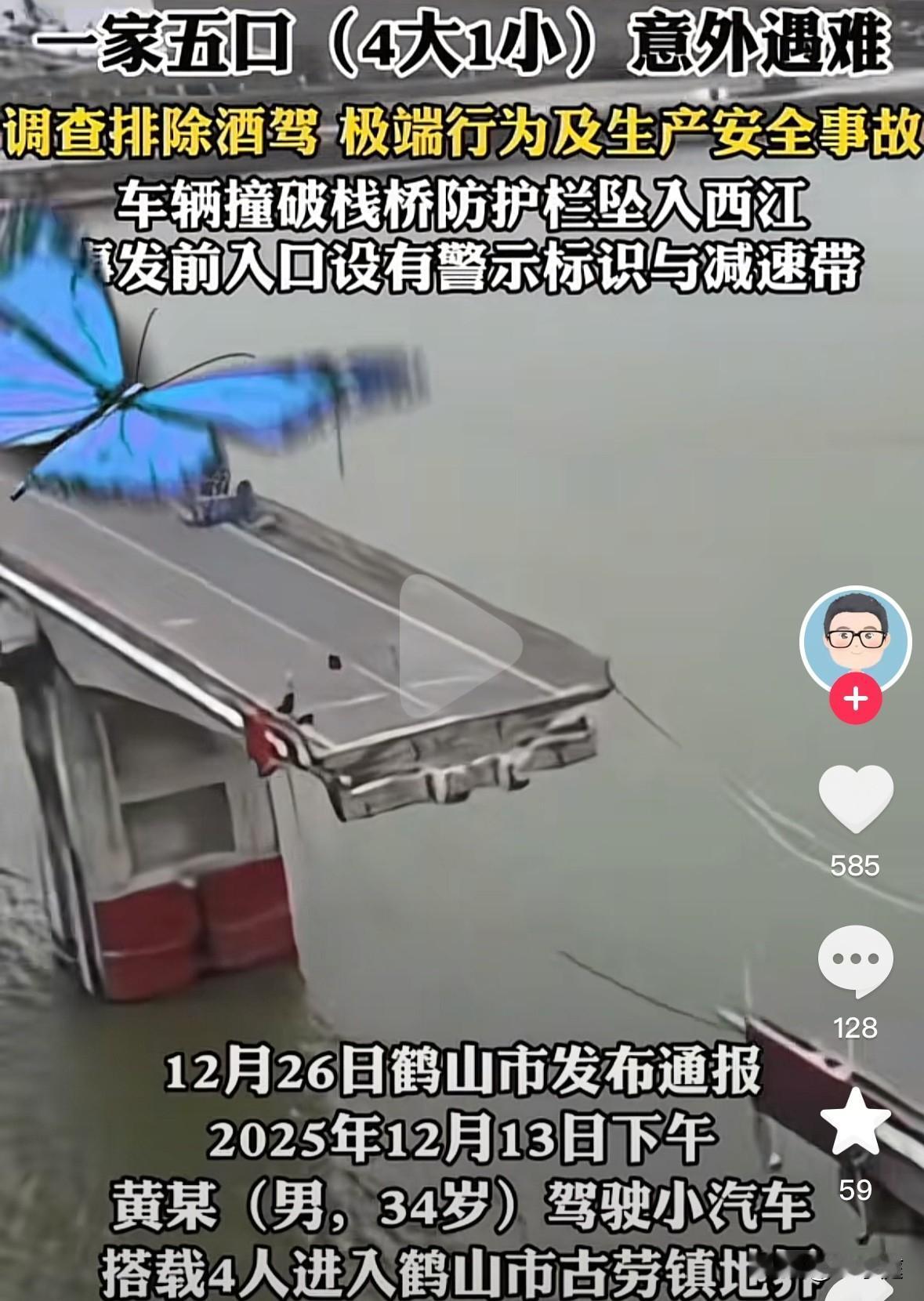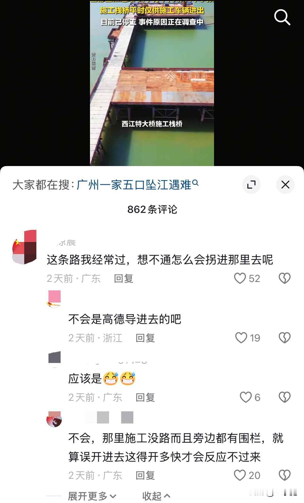 一家五口在江门坠桥事件背后,有一点让人实在是想不通:那座肉眼可见两边都没有接通,正在建设当中的断头大桥,他们究竟是如何开上去的呢? 悲剧发生在12月13日,当天34岁的男车主,带着妻儿,还有六十多岁的母亲及二十多的妹妹从广州出发来到了古劳丽水周边游玩。原本是无比开心的一天,然而,当天下午五点多钟悲剧竟发生了。 他们误入断头大桥后,车子还行驶了一百多米,最终撞上了护栏坠江。 车子是第二天打捞上来的,车上五人无一幸免,均因溺水遇难身亡。 据知情人反馈:遇难者一家人都很和善,是广东梅州人,早在多年前全家都已经定居广州,一年到头也就过年才会回到老家。 悲剧发生后,根据当地相关部门的通报可知:大桥入口设有警示标志牌,并在两侧都设置了减速带,平日里只有施工人员才能进入。 很多当地熟悉路况的居民们也反馈:江边有很宽的双车道,并且都是直来直往。而那座大桥,并没有直接贯通马路,而是要走特定的路才能转过去。且桥的长度很短,在马路上就能肉眼看出其正在建设中。 按道理来说,这样的情况一般人都能准确分辨出那座桥暂且还不能通行。然而,悲剧却还是发生了。 由始至终都想不明白,他们坠江的时间并非是晚上,一座断头桥,一车五个人,难道就没有一个人观察到路况吗?一座那么明显的还在施工的桥,怎么就开上去了呢?由于人都已经不在了,这些点至今无法解释的清晰。 值得一提的是,经过调查可知,车主在驾驶时,并非酒驾、毒驾,且也没有同家人发生争吵! 总而言之,这一家人真的太让人心疼了!在这个悲剧里,对他们一家的遭遇表示深深的同情!但与此同时,也希望大家要有所警示:凡事要多观察,不要盲目抄近路,设有施工警示牌的地方务必遵守相关规定,谨慎慢行。 希望大家去到陌生的城市里时,务必要提前规划好路线,一家人出行,坐副驾的那一位最好是打起12分精神,协助驾驶员查看路况,以便及时发现突发情况。[祈祷][祈祷]