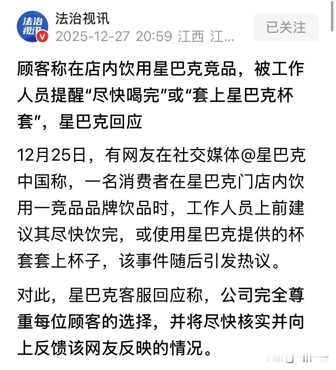 陕西,一女子坐在星巴克店里喝竞争品牌的咖啡,恰好被店员看见,店员上来给女子两个选择,要不尽快喝完,要不套上星巴克的杯套挡住杯子,女子对此十分不悦,她觉得自己好歹是星巴克金星会员,连喝个其他品牌咖啡的自由都没有了?店员未免管的太宽!网友:在别人店里占着位置喝竞品,确实不厚道! 女子是星巴克的忠实粉丝,隔三差五就喝一杯,如今已经是金星会员。 这天,她来到星巴克的店里坐着,但手里拿着的,不是星巴克的咖啡,而是另一家咖啡店的饮品。 在她看来,这也没啥大不了的,不就是喝杯咖啡,在哪喝不是喝? 然而这时,有店员注意到了她手上的咖啡,还发现是某竞品品牌的咖啡。 店员走过来提醒,建议女子要么尽快喝完手里的饮品,要么就用星巴克提供的那个咖啡杯套,把别人的杯子给套上、遮住品牌标识。 这话一说,女子心里瞬间不舒服了。 她在星巴克没少消费,虽然她这次喝的不是星巴克的咖啡,可店里也没贴大字报写着“禁止外带饮料”啊? 她这堂堂金星会员,怎么连喝杯别的牌子咖啡的自由都没有了? 店员上来就让她快点喝或者遮起来,这感觉,就跟她干了啥不合适的事儿被点名了一样,脸上有点挂不住,心里头也觉得被区别对待了。 被店员这么一弄,女子觉得很憋屈、很没面子,感觉自己的选择和消费的权利被冒犯了。 这体验,确实让女子不爽快。 后来,女子的经历被传到了网上。有人就议论,说这规矩是不是太霸道了?管得是不是有点宽? 顾客在店里喝杯别家的咖啡,碍着啥了呢?就因为不是你们家的,就不能大大方方地喝了吗?尤其人家还是你自家的高级会员,这操作,多少有点伤人感情。 后来,就有记者直接一个电话打到了星巴克的客服热线。 工作人员回复说,首先星巴克完全尊重每位顾客的选择。 不过,紧接着客服也解释了一下他们通常的做法。说是从关怀所有顾客的角度出发,他们一般不提倡顾客在门店里吃或者喝那些气味特别大的食物。 但也没正面回应到底能不能在店里喝别的品牌的咖啡。 至于这位女子经历的情况,客服表示会记录下来,马上向公司内部的相关部门反馈上去。 所以,在商业空间里,顾客的边界到底在哪里?商家要求整洁有序的环境和顾客自由消费的权利,这中间的平衡点,该怎么找? 尤其是在没有明文规定的情况下,店员凭感觉进行干预,是不是合适? 星巴克回应“尊重选择”,顾客却实实在在地感到了不爽。 这口头上的尊重和顾客心里的实际感受,显然差了那么点意思。至于最后星巴克内部核实后会怎么处理,这事儿后续会不会引发他们内部管理的小调整,或者就不了了之,咱现在也说不好。 不过也有很多人认为,女子的行为确实不妥当。 你在星巴克店里喝别的品牌咖啡,相当于在星巴克地盘给其他品牌做广告,这人家能乐意吗? 你哪怕在星巴克消费一个甜品,人家都不会说什么!我要开一饭馆,他要是带着外卖来我家吃,还啥也不点,我指定把他撵出去。要是那外卖包装还是我隔壁饭店的,那更是不可能惯着! 消费者不只有权利,也有遵守基本消费规则的义务。这是一种自我遵循的契约精神和道德文化。 那么,从法律角度怎么看待这件事? 《消费者权益保护法》第9条规定:消费者享有自主选择商品或者服务的权利。消费者有权自主选择提供商品或者服务的经营者,自主选择商品品种或者服务方式,自主决定购买或者不购买任何一种商品、接受或者不接受任何一项服务。 工作人员要求消费者“尽快饮完”竞品饮品或使用杯套遮挡的行为,直接触及消费者自主选择权的边界。 根据规定,消费者在合法经营场所内享有“选择何种商品、以何种方式使用”的绝对自主权。 消费者作为金星会员在星巴克门店内饮用竞品饮品,本质是行使选择服务方式的权利。 消费者既可选择购买星巴克饮品,也可选择自带饮品消费环境。星巴克未在门店显著位置张贴“禁止外带食品”标识,即视为默认允许消费者自带饮品。 此时工作人员的干预行为,实质是对消费者选择服务方式的强制限制,构成对自主选择权的侵害。 尽管工作人员是建议的措辞,但还是具有强制性质。 “尽快饮完”隐含对消费时间的限制,剥夺消费者从容使用的权利。其次,“使用杯套遮挡”要求消费者配合隐藏竞品标识,属于变相迫使消费者为商家规则配合表演。 这种行为司法实践中往往被认定为侵犯自主选择权,因经营者不得通过隐蔽手段干预消费者自然选择。 对于这件事,你有什么看法?你站哪边? 欢迎关注@一案一论