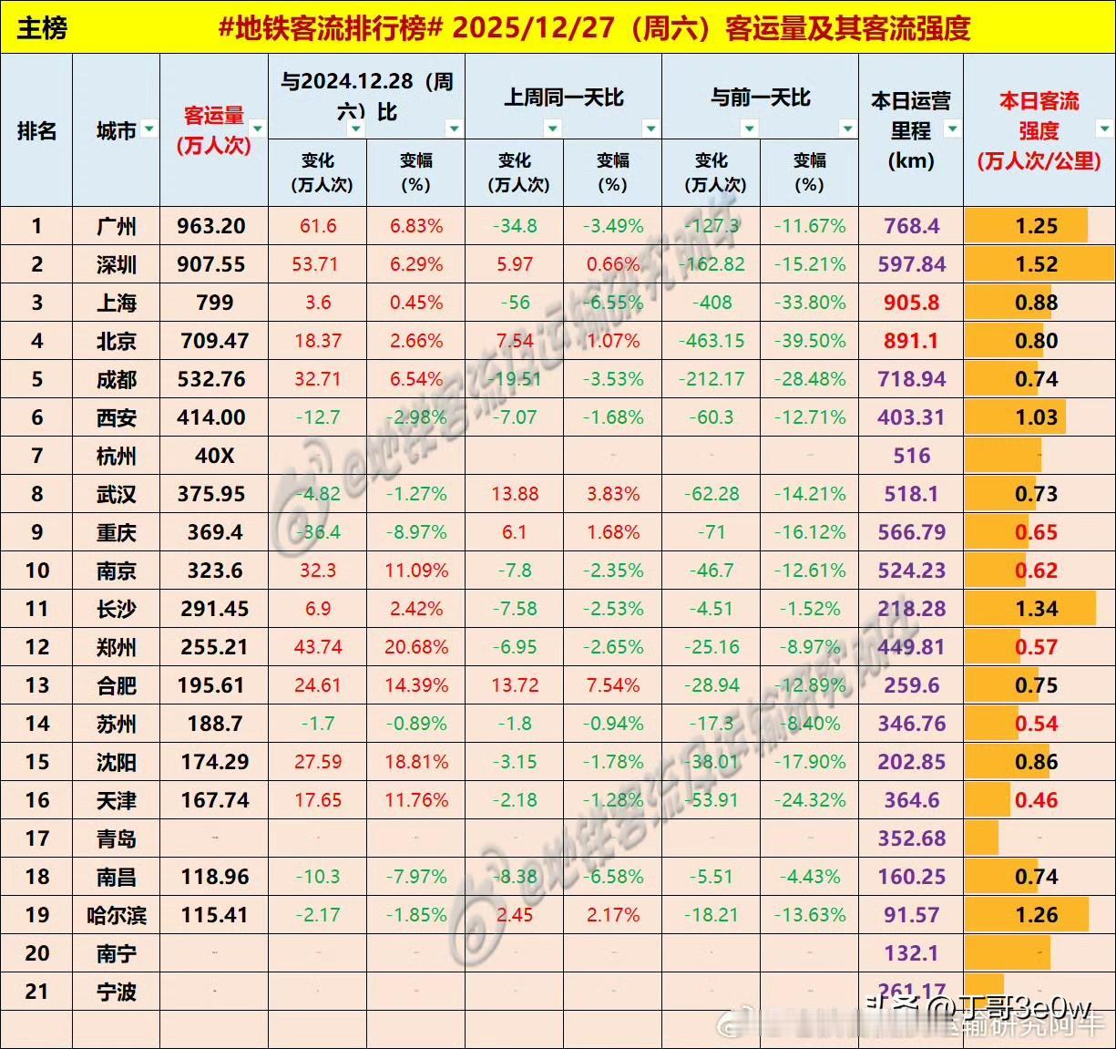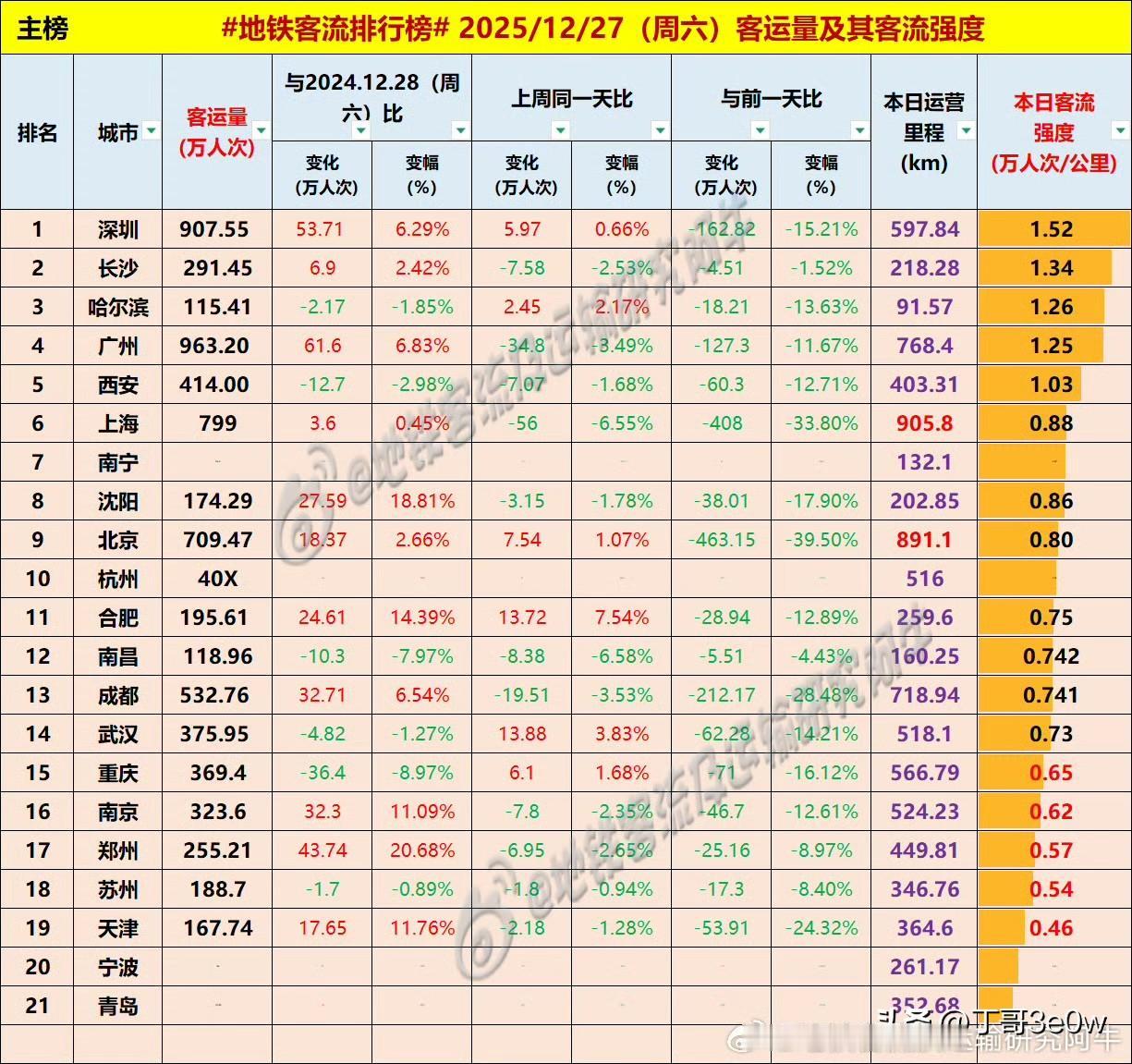 上海地铁客流量周六799万人次,未达800万[呲牙][呲牙][呲牙] 爆料 身边事 上海地铁 周六 2025年12月27日 星期6 全国重点城市轨道交通客流量排行榜: 广州:963.20万广州地铁 深圳:907.55万深圳地铁 上海:799.00万 北京:709.47万北京身边事 成都:535.83万 西安:414.00万西安爆料 杭州:400万+杭州地铁 武汉:375.95万 重庆:369.40万重庆身边事 南京:323.60万南京爆料 长沙:291.45万长沙地铁 郑州:255.21万 合肥:195.61万合肥身边事 苏州:188.70万苏州爆料 沈阳:174.29万沈阳地铁 天津:167.74万天津身边事 青岛:110万+ 南昌:118.96万南昌爆料 哈尔滨115.41万哈尔滨爆料 南宁:100万+南宁地铁 宁波:100万*