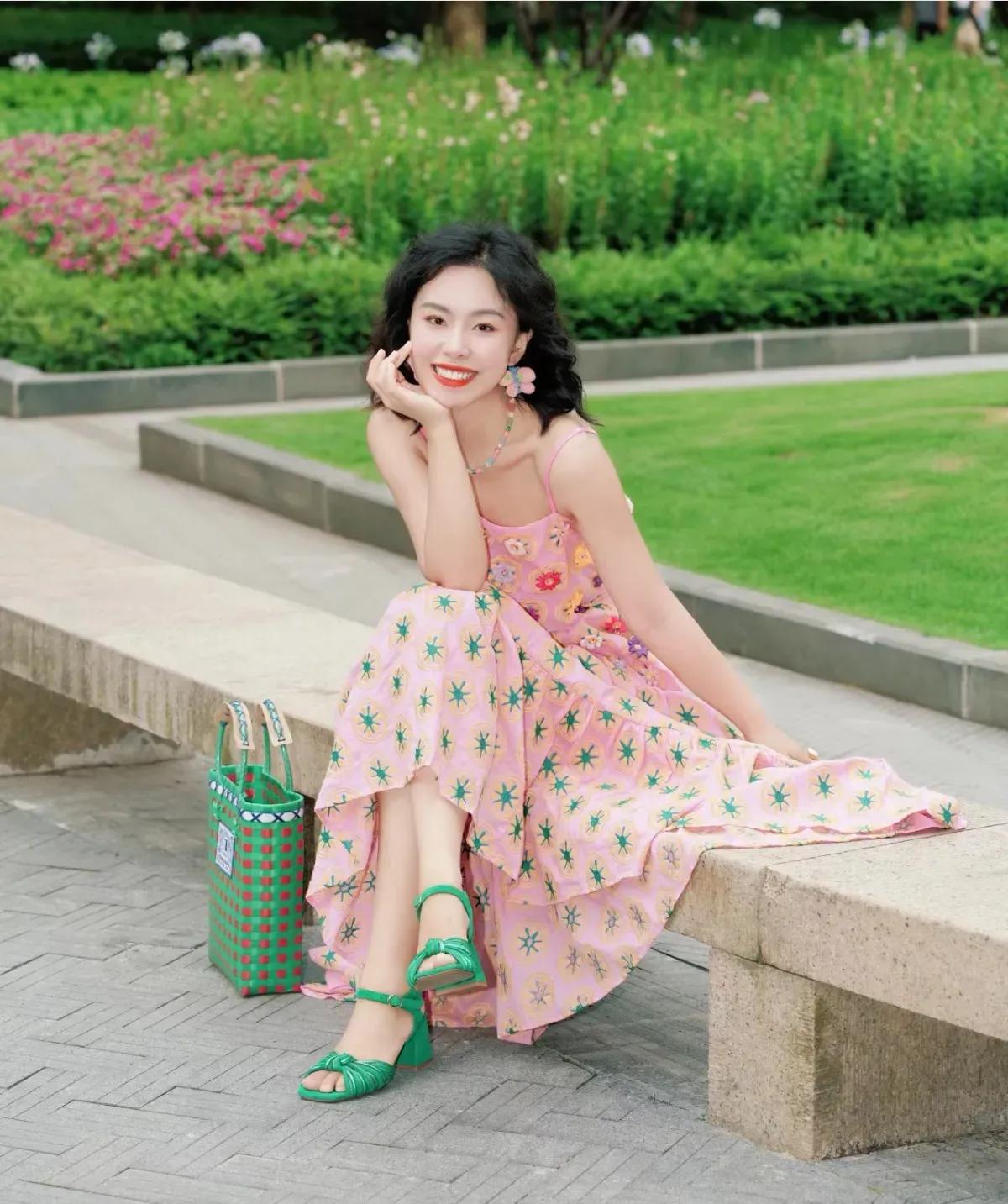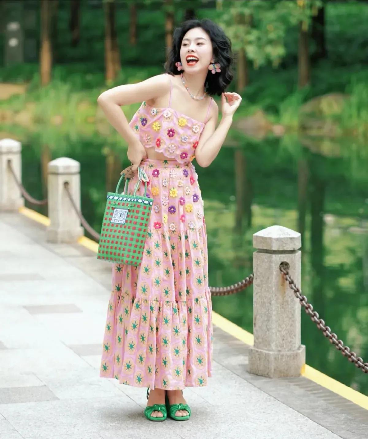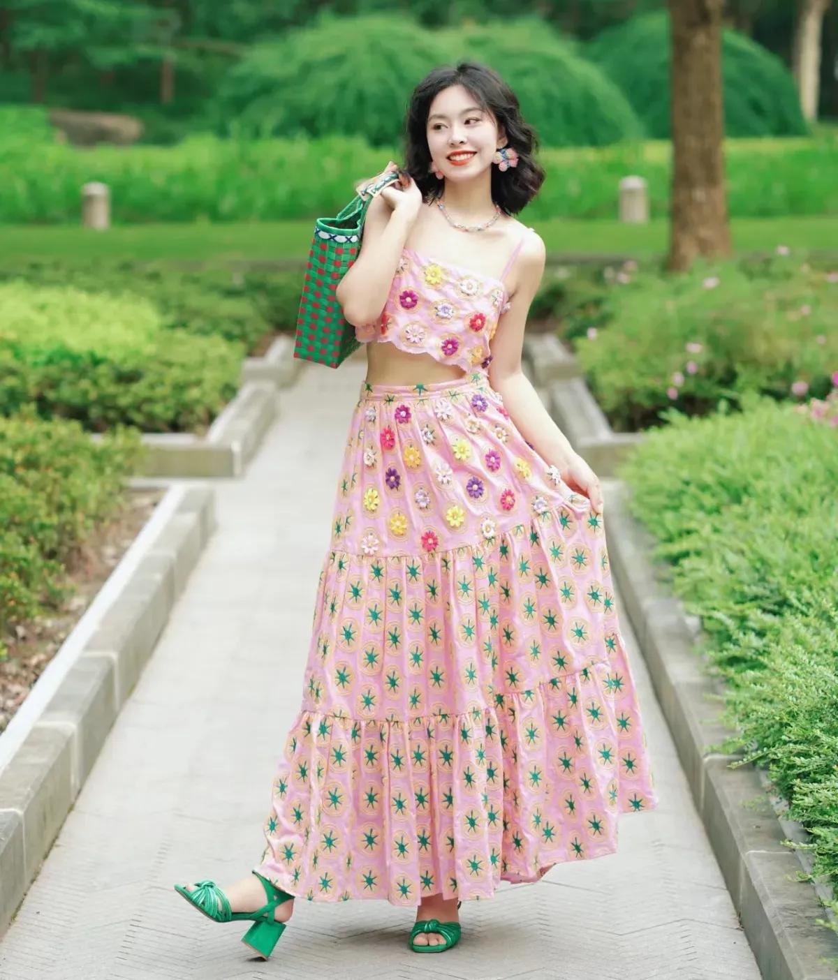这套穿搭是活泼甜美的撞色碎花度假风,把明媚色彩和复古童趣完美融合,特别适配春夏户外场景。粉色碎花吊带+同色系长裙的套装自带清新甜美元素,立体花朵装饰+星星印花注入童趣感,露腰设计,宽松裙摆营造松弛度假氛围。 搭配红绿格纹包+荧光绿凉鞋形成撞色,强化了造型的明媚活力;复古耳饰点缀,让童趣风格更显精致,不会过于花哨。充分展现穿着者活泼甜美的明媚魅力。温柔碎花裙穿搭 碎花夏天穿搭