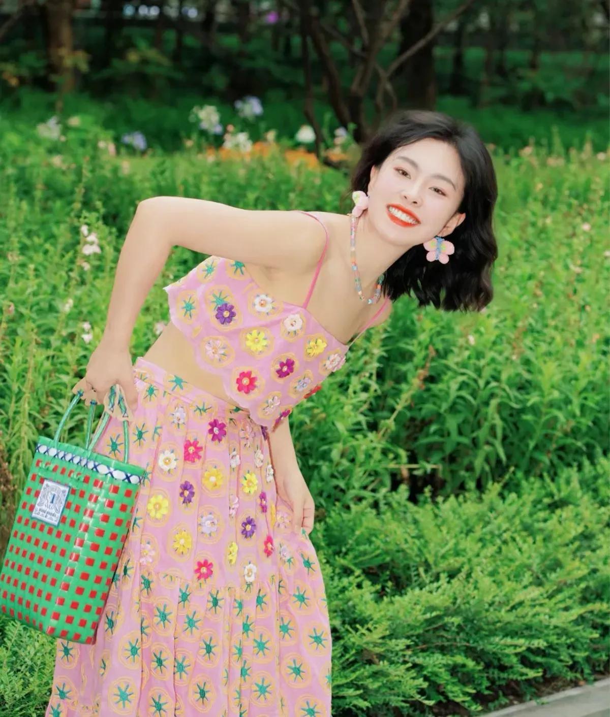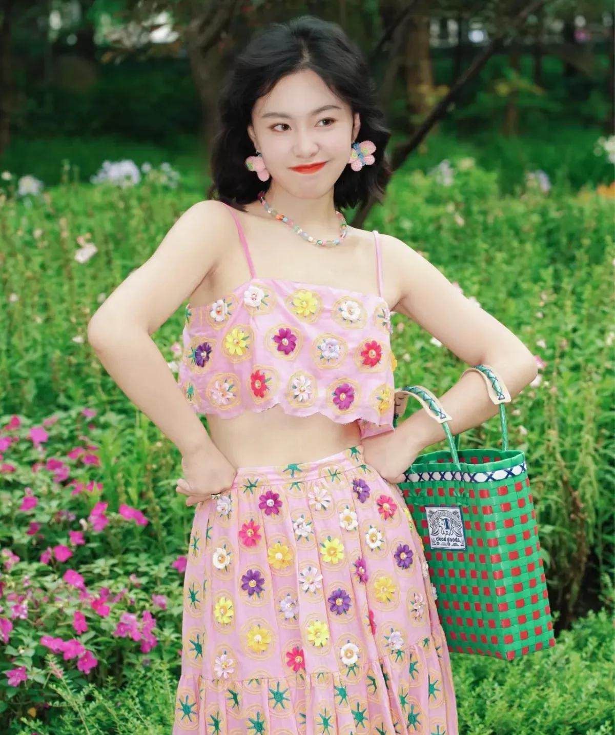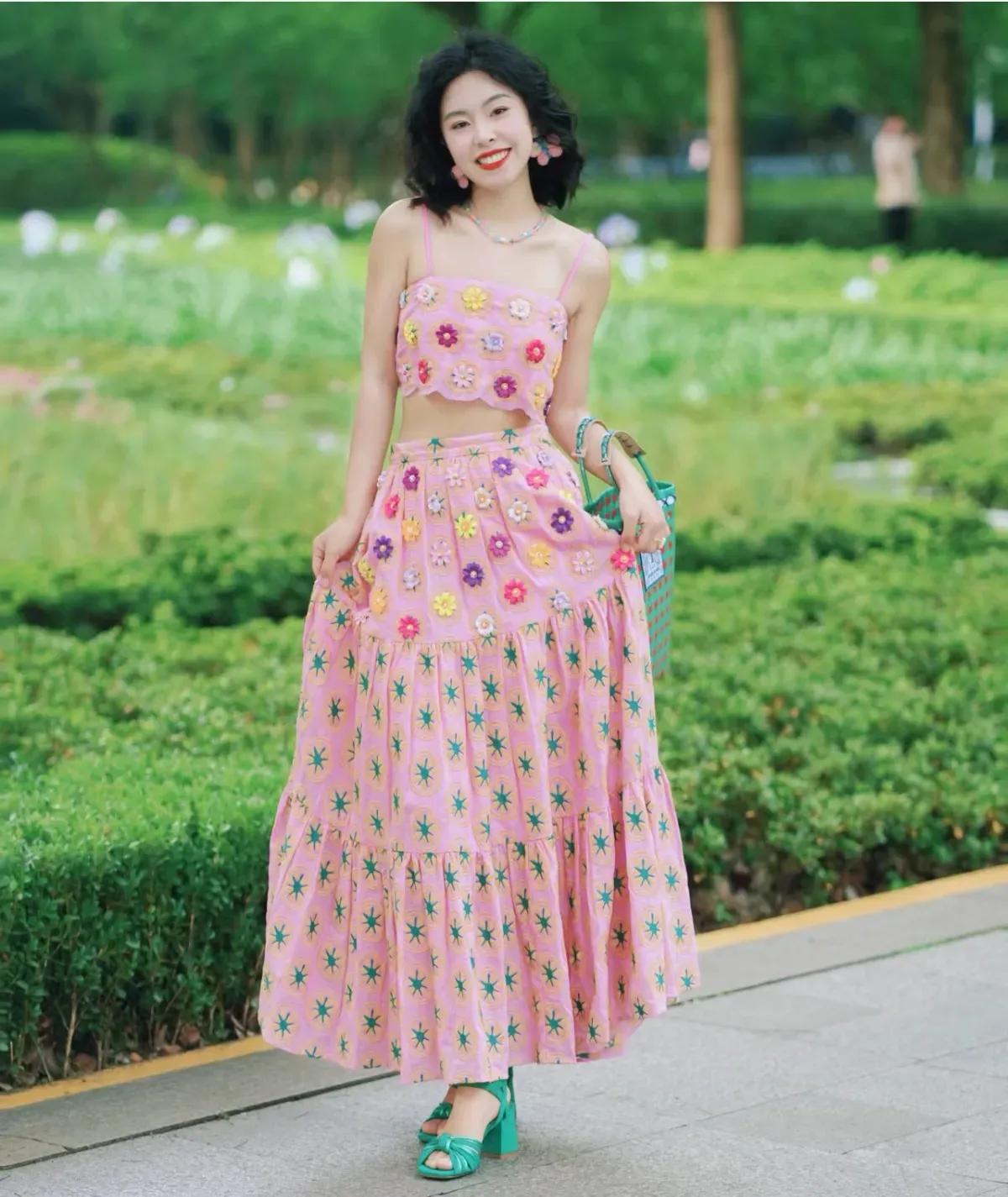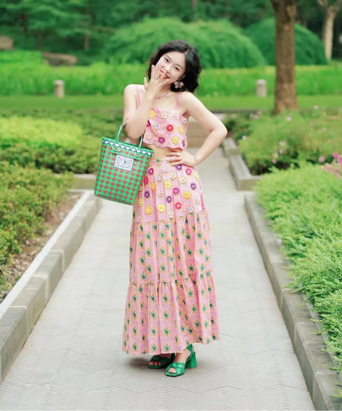 这套穿搭是活泼甜美的撞色碎花度假风,把明媚色彩和复古童趣完美融合,特别适配春夏户外场景。粉色碎花吊带+同色系长裙的套装自带清新甜美元素,立体花朵装饰+星星印花注入童趣感,露腰设计,宽松裙摆营造松弛度假氛围。 搭配红绿格纹包+荧光绿凉鞋形成撞色,强化了造型的明媚活力;复古耳饰点缀,让童趣风格更显精致,不会过于花哨。充分展现穿着者活泼甜美的明媚魅力。温柔碎花裙穿搭 碎花夏天穿搭