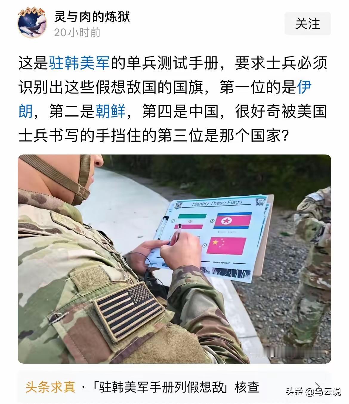 被美国士兵书写的手,挡住的第三个假想敌国家是哪个国家,很明显是俄罗斯的国旗! 其实可以看到,上面是白条的,中间那色条被士兵握板的手大拇指摁住的,露了一点蓝色,基本上可以断定是白、蓝、红三色条旗,俄罗斯🇷🇺国旗无疑了。