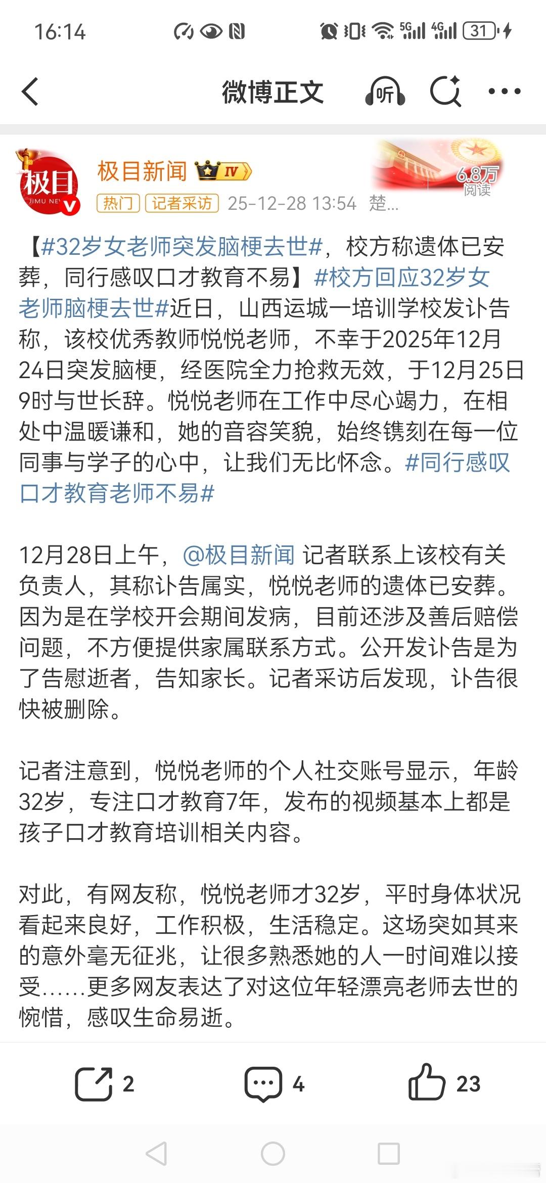 【32岁女老师突发脑梗去世校方回应32岁女老师脑梗去世同行感叹口才教育老师不易 现在发生脑梗心梗的人怎么这么多啊,不知道什么原因引起的,众人该如何防止。 给我们提醒一定要注意身体健康,多休息,心态要好,没有什么比活着重要的了。愿悦悦老师一路走好 作为培训学校,带着感情和温度依法妥善处理女老师的善后事宜,作为女教师的家属,在法治思维下和培训学长浙商解决最好。