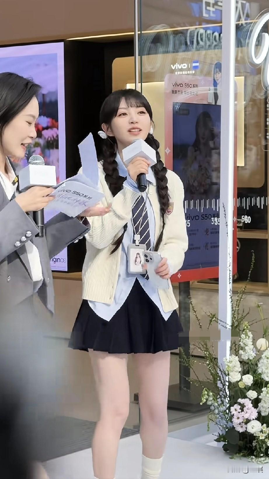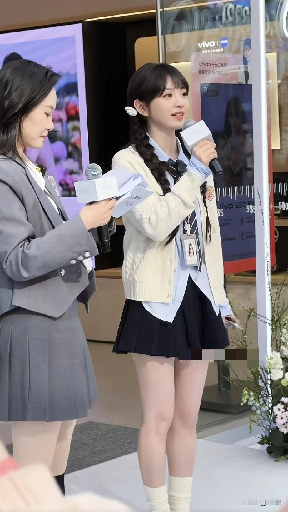 田曦薇在活动现场,她身着清新学院风穿搭,麻花辫搭配白色发饰尽显甜美,手持话筒似在进行互动分享,身旁的搭档也以干练的职业套装造型配合着活动流程
