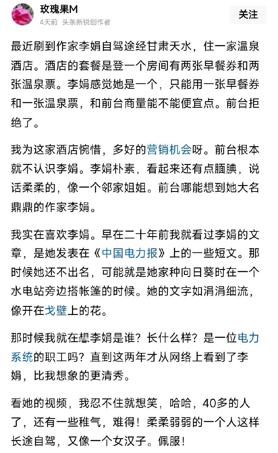 最近刷到作家李娟自驾途经甘肃天水,住一家温泉酒店。酒店的套餐是登一个房间有两张早餐券和两张温泉票。李娟感觉她是一个,只能用一张早餐券和一张温泉票,和前台商量能不能便宜点。前台拒绝了。 现在的标间已经完全不能满足实际需求了,很多客人及时两人出行,也为了不相互影响而单独住宿。何况还有很多单独出行的旅客,所以建议尽快普及单人房,最起码单人房和标间要同等数量! 西北人直性子脑子不象南方人灵活,我右伊利工地打工时因去工地没有车就在镇上问跑拉人三轮车价格,司机问了地址后说一个人五元,我们人多就和司机商量能不能两个人坐一个车一人便宜点8元,司机认死理说不行,我们几人就一人叫了一辆车。这事若放在南方肯定司机乐意拉两人一淌挣16元。这就是西北人和南方人的区别,南方人精明会挣钱,精明的南方人到北方如鱼得水比在他们南方都精明的群体里挣钱更容易。北方人去南方大都是打工,南方人在北方大都是做生意。 服务员心里,只有酒店的规则,没有名人。酒店的经理可能也没有,酒店的老板可能有,前提是老板认识她。这说明,她不过是个作家,不是玩家。逻辑不对啊,因为是名人就要与众不同享受优惠? 酒店面前人人平等,要优惠所有人都应该统一适用优惠规定。李娟文学 李娟随笔 李娟心灵笔记 李娟语录 李娟小说 李娟爱情故事 李娟访谈