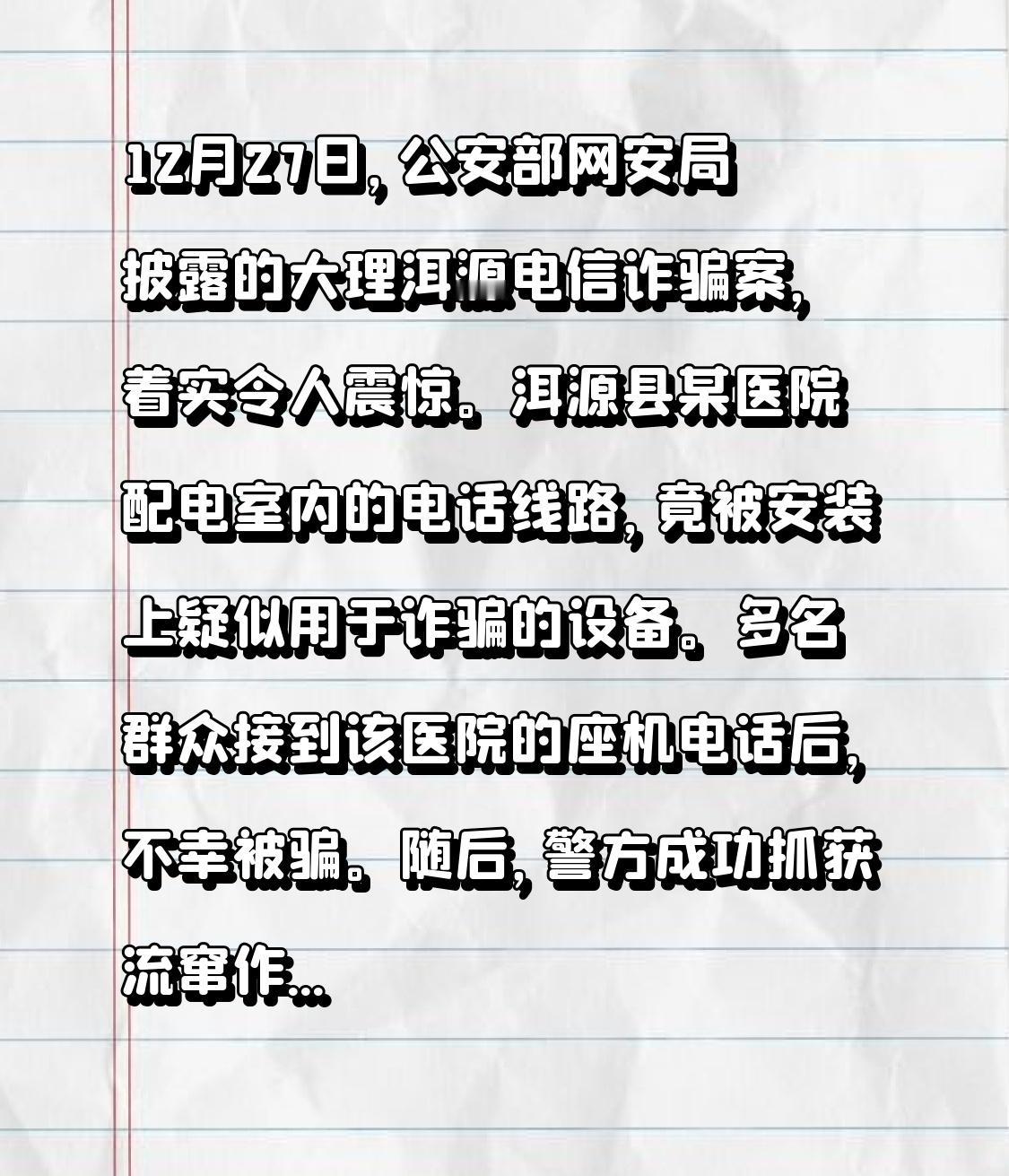 洱源某医院配电室内电话线路被用于电信诈骗,公安通报:周某、倪某被抓,涉事医院被追责 12月27日,公安部网安局披露的大理洱源电信诈骗案,着实令人震惊。洱源县某医院配电室内的电话线路,竟被安装上疑似用于诈骗的设备。多名群众接到该医院的座机电话后,不幸被骗。 随后,警方成功抓获流窜作案的周某、倪某,二人也受到了拘留、罚款等处罚。涉事医院因未履行网络安全保护义务,被依法追究责任。如今,不法分子将目标瞄准了医院等机构的弱电井、配电室,利用VoIP设备伪装号码实施诈骗。 这起案件为各机构敲响了警钟,必须加强管理,杜绝类似事件再次发生,切实守护好大家的财产安全。