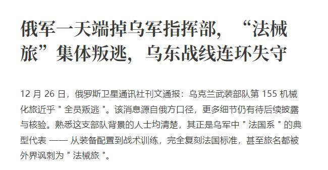 兵败如山倒!俄军攻入指挥部,乌克兰法械旅全员叛逃 “乌克兰军队正滑向全面崩溃的边缘”,这几乎已经成为了全球所有观察家的共识。26日,俄罗斯卫星社报道称,俄军方面确认,乌军最精锐之一的部队——乌军第155独立机械化旅几乎全员从前线叛逃。还有西方媒体称,曾经被捧为“精英部队”的乌军第47独立机械化旅“马古拉”,也早已无力完成基本作战任务。 要知道这第155独立机械化旅可不是普通部队,从组建之初就被打上了“法式精英”的标签,由法国全程负责战术训练,配备了全套西式装备,包括法制AMX-10轻型坦克、“凯撒”自行榴弹炮以及德制“豹2A4”主战坦克等造价高昂的武器,按照规划本应成为改变战场局势的精锐力量,却最终用全员叛逃的方式给西方援乌模式泼了一盆冷水。 这支部队的崩溃绝非偶然,从组建阶段就乱象丛生,原计划招募5800人的建制,最终仅有1924人前往法国受训,而在赴法之前就已有1100人擅自离队成为逃兵,在法国受训期间又有50人趁机脱逃,等到2024年11月受训完毕返回乌克兰后,首次参战前再添1700人离队记录,其中500人直接失踪,这种持续的逃兵潮早已预示了其最终结局。 可这支部队中仅有51人拥有超过一年的从军经历,其余1414人都是入伍不超过两个月的新兵,在法国短短两个多月的仓促培训,根本无法让他们具备应对高强度战场的能力。 而法国为这支部队量身打造的装备也成了中看不中用的摆设,AMX装甲平台防护薄弱、凯撒榴弹炮对侦察干扰高度敏感,在俄军滑翔炸弹、FPV无人机的精准打击下沦为活靶子,所谓的“西式优势”在实战中彻底沦为笑柄。 与第155旅的叛逃相呼应,俄军对乌军指挥体系的精准打击更是加速了其崩溃进程,2025年12月25日,俄军突击队成功突入乌军位于胡里艾伯勒市中心的一处营级指挥观察点,现场遗留的电脑设备、通信终端、作战地图甚至未上锁的手机,都足以证明乌军指挥人员溃败时的仓皇失措。 而这处指挥点正是乌军在该区域的核心作战协调枢纽,其被拔除直接导致胡里艾伯勒地区陷入攻防胶着的“灰色地带”,乌军紧急调集增援部队也难以扭转局势。 这种战术节点的接连失守,与第155旅的叛逃形成了战术串联效应,使得乌军防御体系在多个战区陷入系统性瘫痪。 曾经被西方媒体捧为“反攻先锋”的乌军第47独立机械化旅“马古拉”,同样未能逃脱崩溃的命运,欧洲媒体披露,该旅在苏梅州尤纳基夫卡的反攻行动中惨遭覆灭,67名外国雇佣兵被击毙,其中还包括北约高级顾问级别的“大鱼”,俄军甚至公开了从雇佣兵尸体上缴获的身份牌,印证了这支部队的惨败。 第47旅的覆灭并非个例,而是乌军整体战力枯竭的真实写照,随着俄乌冲突持续至第三年,乌军兵力储备早已捉襟见肘,只能依靠大规模强制征兵补充兵源,而这些被强行征召的士兵大多缺乏基础训练,甚至有新兵仅受训两天就被推上战场,美国媒体《华尔街日报》的数据显示,乌军新兵的伤亡率高达80%至90%,如此高昂的伤亡代价,让前线士兵的厌战情绪愈发浓厚。 乌军的全面崩溃,更体现在其无法逆转的人员流失与后勤困境上,不同渠道的数据都指向了乌军严重的逃兵问题,美国媒体《军事观察》称乌军每月逃兵人数超过4万人,乌克兰议员斯科罗霍德透露逃兵已接近40万人,英国《每日电讯报》的评估则更为惊人,认为乌军逃兵总数已达65万人,俄罗斯总统普京也曾明确表示乌克兰逃兵人数高达数十万。 为了掩盖这一丑闻,乌克兰总检察长办公室早已不再允许公众查阅有关逃兵案件的数据,这种欲盖弥彰的做法恰恰说明了问题的严重性。 后勤保障的缺失则进一步加剧了军队的溃散,乌克兰议员坦言,军方未能为士兵提供最低限度的基本军事物资,士兵和军官被迫自费或依靠志愿者团体的资金填补缺口,部队内部还存在严重的腐败现象,有指挥官以“设备捐款”为名向下属索贿,甚至对士兵使用暴力,这种混乱的管理体系让本就低迷的士气雪上加霜。 从西方援乌的角度来看,乌军的崩溃更是对其军事援助模式的彻底否定,法国耗费巨资打造的第155法械旅,最终用全员叛逃的方式终结了这场“西式样板工程”,所谓的北约战术与西式装备,在缺乏战斗意志、训练不足且后勤混乱的乌军手中,完全无法发挥作用,反而因复杂的操作流程和高昂的维护成本成为负担。 欧盟承诺的900亿欧元援助资金迟迟无法到位,美国则坚定要求俄乌停火,西方盟友的态度转变让乌军的处境雪上加霜,失去了外部援助的支撑,本就摇摇欲坠的乌军防御体系更是不堪一击。 可以说,乌军的全面崩溃并非单一战役的失利,而是人员、装备、后勤、指挥以及外部援助等多重因素共同作用的结果,第155旅的全员叛逃与第47旅的战力尽失,不过是这场崩溃大戏的冰山一角,随着俄军在各战线的持续推进,乌军的溃败态势还将进一步加剧。