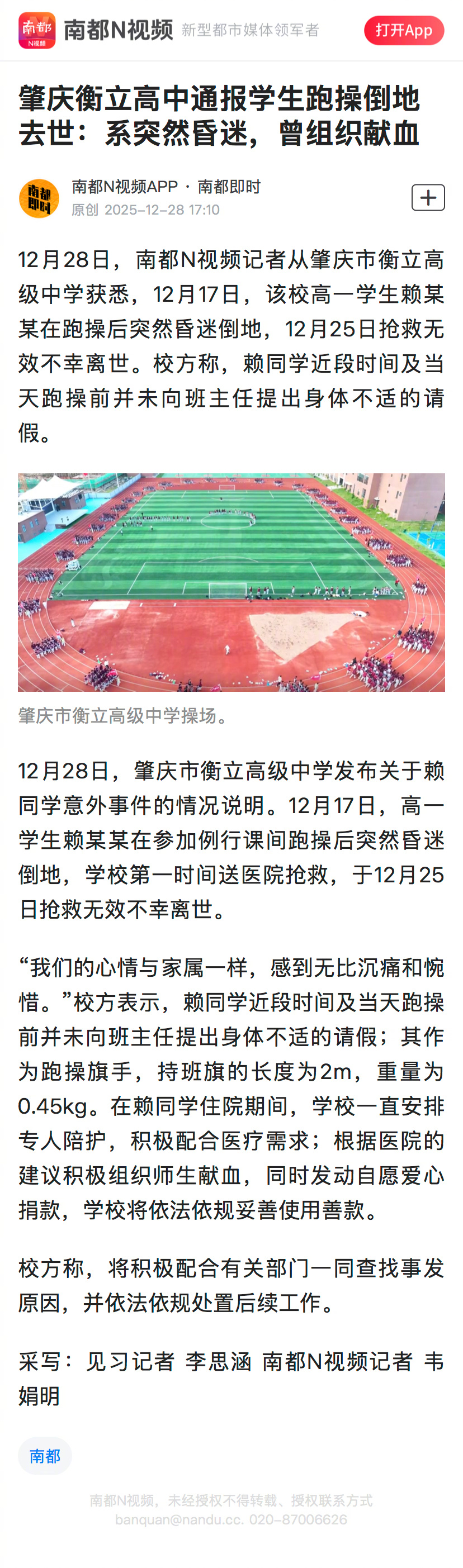 #校方称跑操离世学生系突发昏迷#【肇庆衡立高中通报学生跑操倒地去世:系突然昏迷,曾组织献血】#校方回应高中生跑操后离世##肇庆一高中生跑操后抢救无效离世#12月28日,南都N视频记者从肇庆市衡立高级中学获悉,12月17日,该校高一学生赖某某在跑操后突然昏迷倒地,12月25日抢救无效不幸离世。校方称,赖同学近段时间及当天跑操前并未向班主任提出身体不适的请假。南都N视频记者 韦娟明 见习记者 李思涵 肇庆衡立高中通报学生跑操倒地去世:系突然昏迷,曾组织献血