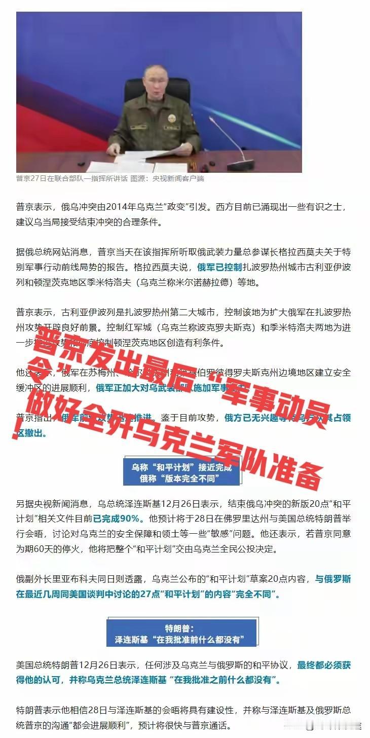 普京戎装现身:俄武装最高统帅会议,发出动员令:若乌方不愿和平解决 ,俄将武装全剿乌克兰! 历经三年多的俄乌冲突,普京表示 俄军已经牢牢的掌握了战场的主动权,只要俄罗斯人民愿意,一定能全歼乌克兰军队,并解决所有的问题。反之 如果乌克兰有意愿和平解决冲突,俄罗斯的和谈大门一直是开着的。 俄普京在会议会展现了俄罗斯军队取得的佳绩: 🔹 控制红军城与季米特洛夫,为彻底解放顿涅茨克人民共和国创造了有利条件; 🔹 解放古利亚伊波列为在扎波罗热州推进攻势开辟了良好前景; 🔹 俄罗斯曾呼吁乌克兰给予顿巴斯居民合法的自决权,但基辅选择开战; 🔹 西方有人建议基辅接受体面的冲突结束条件,但基辅政权不愿和平解决; 🔹 在俄军的进攻节奏下,俄罗斯对乌军撤出所占区域已几乎不感兴趣。 2022年2月24日,随着普京总统的一声令下,俄罗斯正式对乌克兰发起特别军事行动。而到2025年 12 月26 日,冲突已经持续了整整三年半多的时间了。到今年年底,俄罗斯总共控制着乌克兰约18%的领土,其中包括克里米亚、顿涅茨克州的75%、卢甘斯克州的100%,以及扎波罗热州和赫尔松州各74%。 同时 12 月 28 日泽连斯基即将在美国与特朗普会面,重点讨论美国提出的 28 点和平解决冲突的计划,这也充份表明乌克兰败绩明显的情况之下,并希望解决历经三年半多时间的冲突,而在欧美支援之下的俄乌冲突,乌克兰已经看不到任何胜算,而美国在撤出,欧洲越来越力不从心了。 所以普京此时主持俄联邦武装最高统帅会议,再次向全军发出最后的战斗动员论,在胜利的最后关头,俄有能力通过武装方式解决乌克全所有的问题,这一切就看泽连斯期的意愿,普京要求全军做好最后收尾的军事准备!