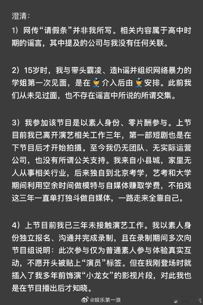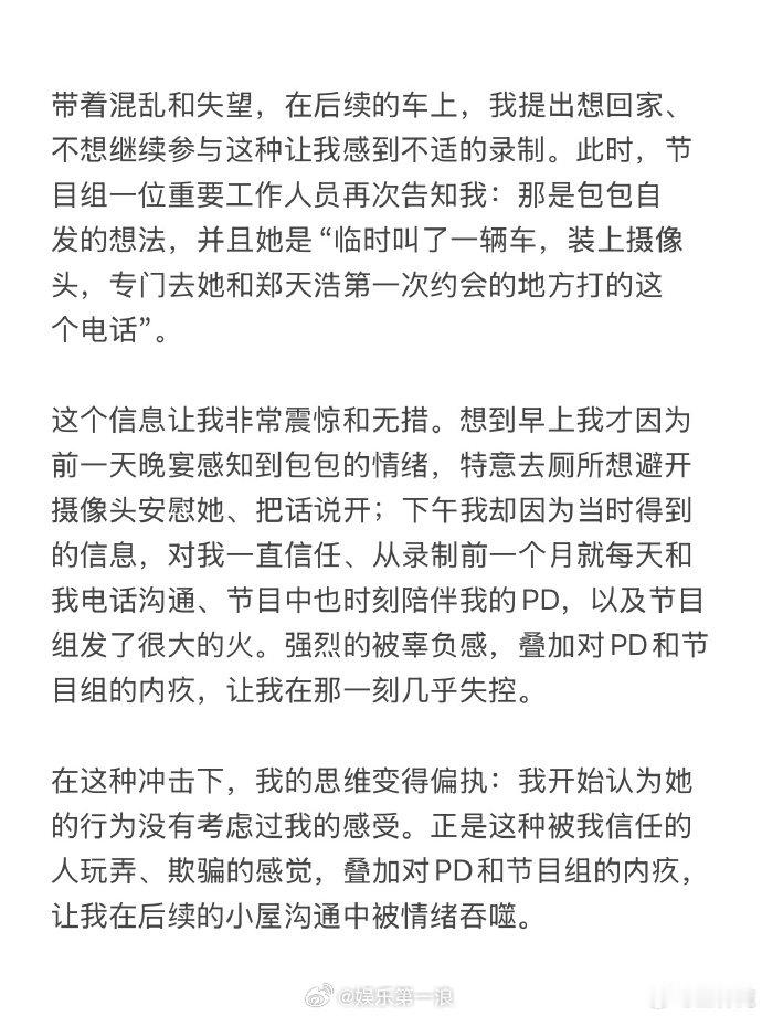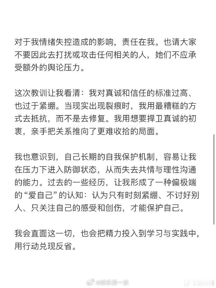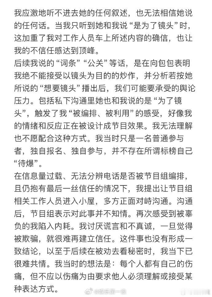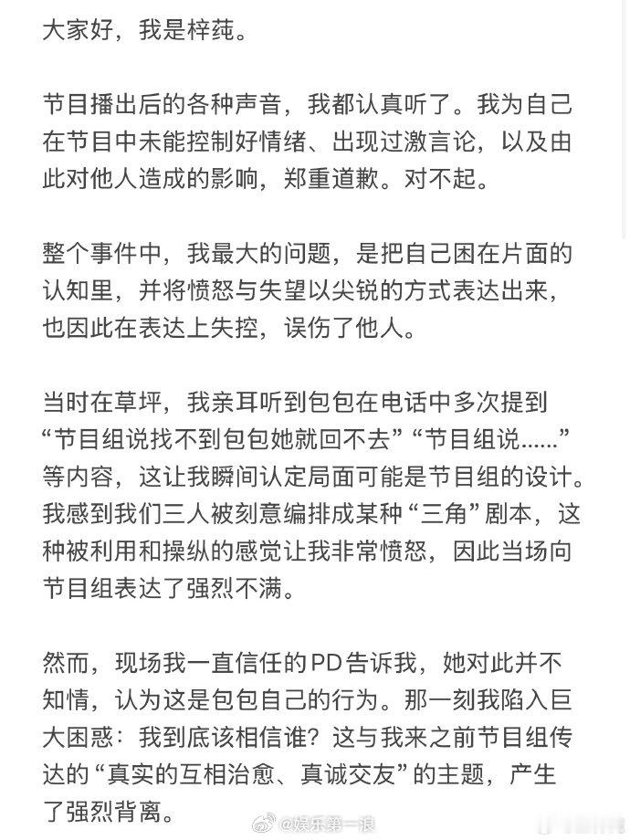 王梓莼回应王梓莼 我没有霸凌任何人 近期,王梓莼因在恋综中对另一名女嘉宾包洁仪发表不当言论引争议。刚刚,发长文回应,她为在节目中没有控制好情绪道歉,她称自己当时情绪失控是因为被信任的人玩弄叠加对节目组和pd的内疚。节目后她已和包洁仪诚恳沟通并道歉,称“我的情绪反应源于自我保护,与男的无关。我没有霸凌任何人。 ”