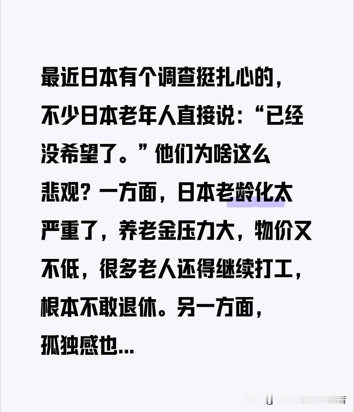 最近日本有个调查挺扎心的,不少日本老年人直接说:“已经没希望了。” 他们为啥这么悲观?一方面,日本老龄化太严重了,养老金压力大,物价又不低,很多老人还得继续打工,根本不敢退休。另一方面,孤独感也很强烈,子女忙工作,有的甚至不在身边,老人平时连个说话的人都难找。 再加上日本社会节奏快、压力大,很多老人觉得自己被时代“落下”了,学不会新东西,也看不到未来的变化,只能一天天熬日子。 这事儿也给我们提个醒:养老不只是钱的问题,还有陪伴、尊重和心理上的安全感。等我们老了,希望不只是“活着”,而是还能觉得:生活,有点盼头。