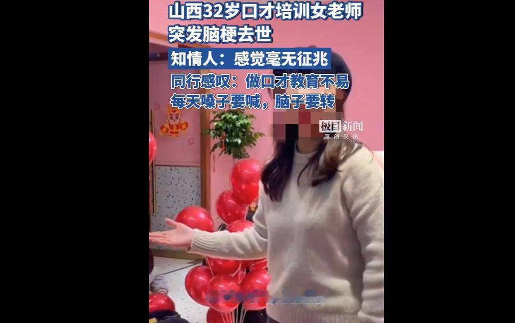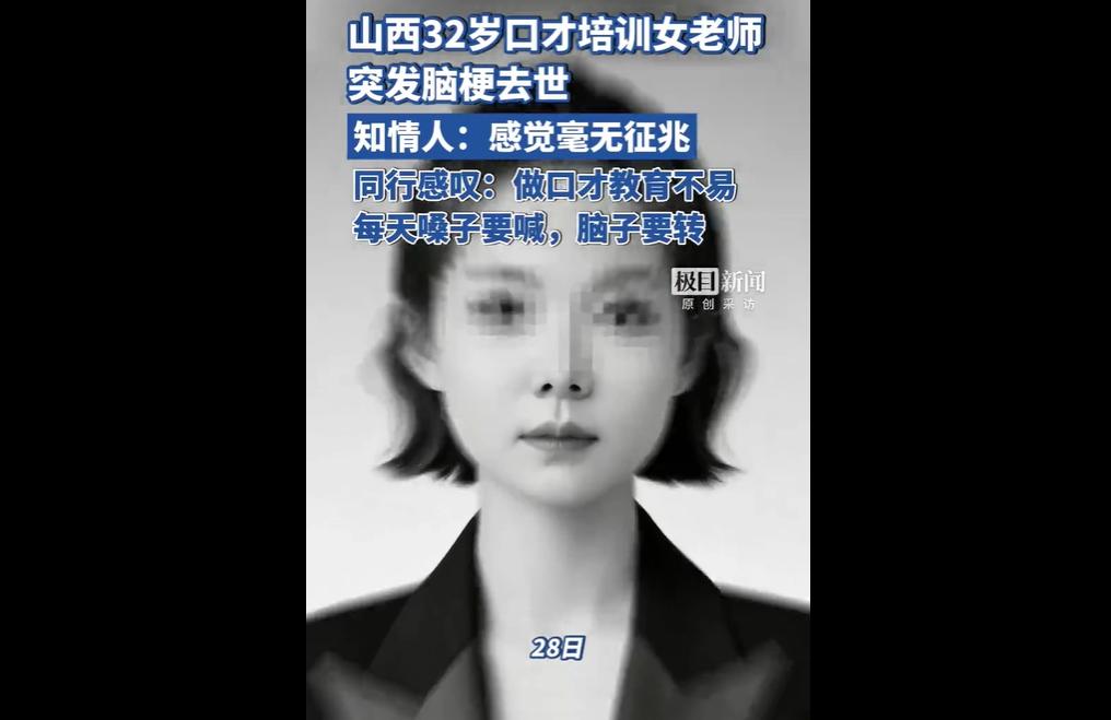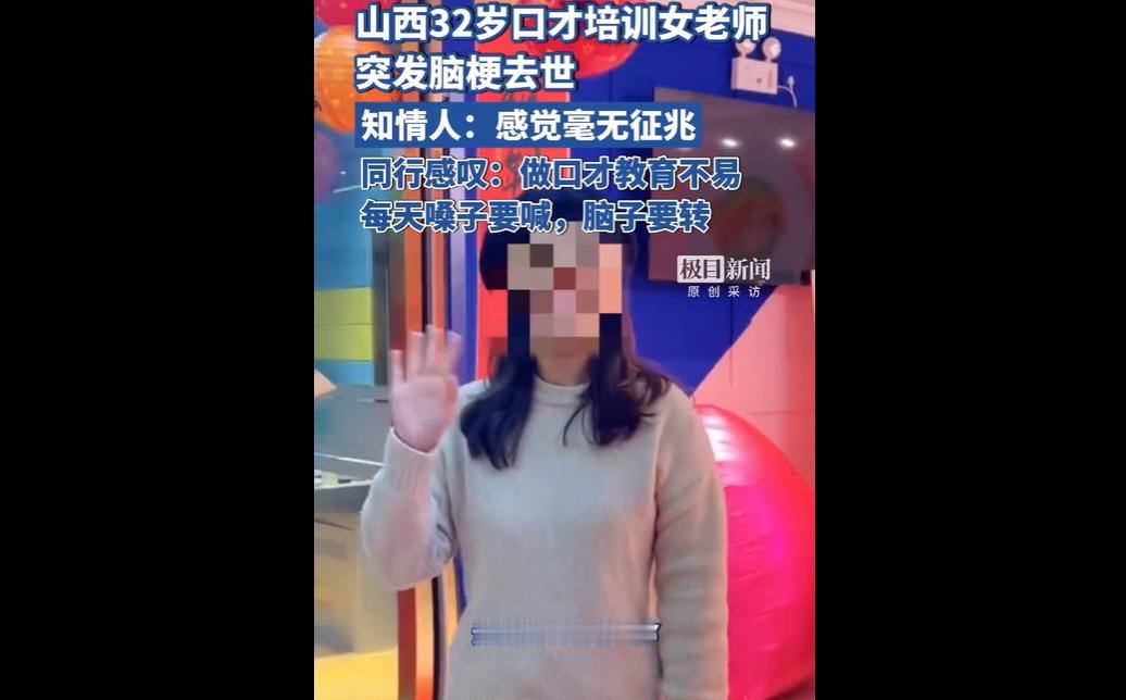 山西运城32岁口才老师悦悦,12月24日在学校开会期间突发脑梗,抢救无效后于25日离世,遗体已安葬,善后赔偿问题待处理。 其深耕口才教育7年,同行感叹该行业常需熬夜备课、用嗓过度,连喝水都顾不上。 网友惋惜年轻生命逝去,呼吁重视职场健康。 32岁,正是人生盛放的年纪,却因突发脑梗匆匆离世,悦悦老师的悲剧,简直是给所有拼命工作的年轻人一记沉痛耳光! 深耕口才教育7年,每天嗓子喊到沙哑、脑子高速运转,备课到深夜、赶课连水都顾不上喝,把“年轻扛得住”当成口头禅,最终让热爱的事业,变成了透支生命的枷锁,何其可惜,又何其可悲! 多少老师表面光鲜,背后藏着熬不完的夜、备不完的课、用废的嗓子和停不下来的节奏? 为了赶进度、出效果,连口水都没时间喝,连休息都觉得是浪费,总觉得年轻就是资本,身体能扛住所有压力,却忘了身体的预警信号,从来不会提前打招呼。 脑梗看似突发,实则是长期过劳、身心俱疲的必然结果,是身体在极限透支后,发出的最终抗议!