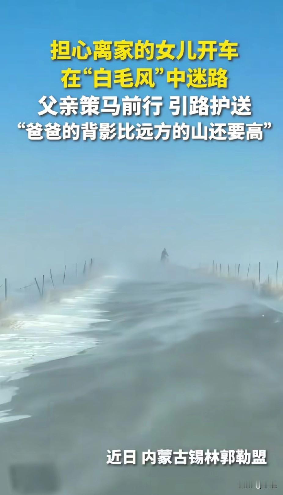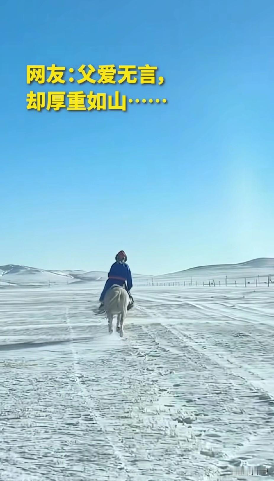 刮起了“白毛风” 父亲担心离家的女儿开车迷路 策马前行一路护送。 这一刻,是父爱的具象化。 父亲的背影如山川般巨大, 前面的路尽管坎坷, 但坚定不移地向前走。 因为他知道, 身后是他的孩子, 是他拿命守护的人。 父亲的脊背或许会被岁月压弯, 那份为子女撑起一片天的力量, 永远厚重如山。 就像这草原上的山, 沉默,却始终伫立。 分享今日的感悟 父亲是孩子永远的偶像 父爱如山