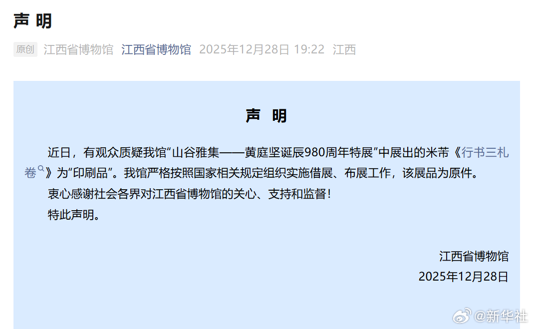 【#江西省博声明展出米芾作品为原件#】近日,有观众质疑江西省博物馆“山谷雅集——黄庭坚诞辰980周年特展”中展出的米芾《行书三札卷》为“印刷品”。对此,江西省博物馆28日发布声明称,展品为原件。#江西省博确认米芾展品为原件# 展览自2025年12月16日开幕,其中米芾《行书三札卷》与黄庭坚的《草书浣花溪图引卷》《行书青衣江题名卷》等作品共同展出。 展览期间,有观众质疑米芾《行书三札卷》为“印刷品”。对此,江西省博物馆在声明中称,省博物馆严格按照国家相关规定组织实施借展、布展工作,展品为原件,并表示感谢社会各界对江西省博物馆的关心、支持和监督。