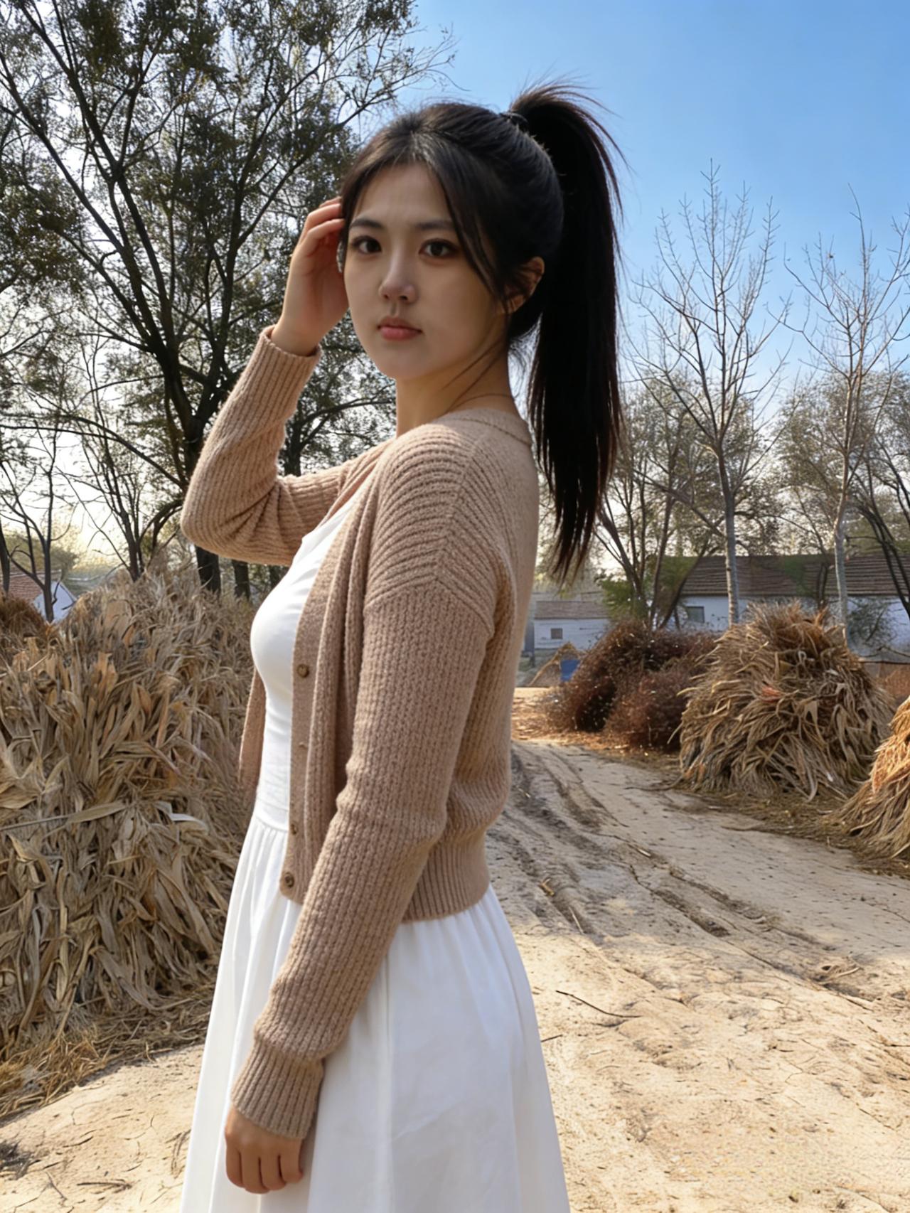 她走进乡野 裸色裙装便融了进去 与泥土的黄,玉米杆的褐 树影的绿,织成了一体 ~ 长发被风掀动,触着枯黄的秸杆 指尖垂落,离泥土只有一寸的距离 她的呼吸,混着乡野的气息 没有都市的隔阂,只有自然的亲近 ~ 阳光洒下,镀亮她的轮廓 裙身的褶皱,盛着细碎的光 乡路的每一粒尘,都沾着她的温柔 她的每一寸肌肤,都映着乡野的晴 ~ 在乡野里,她不是过客 是归人,是自然的一部分 裸色的裙,是她与乡野 最默契的语言
