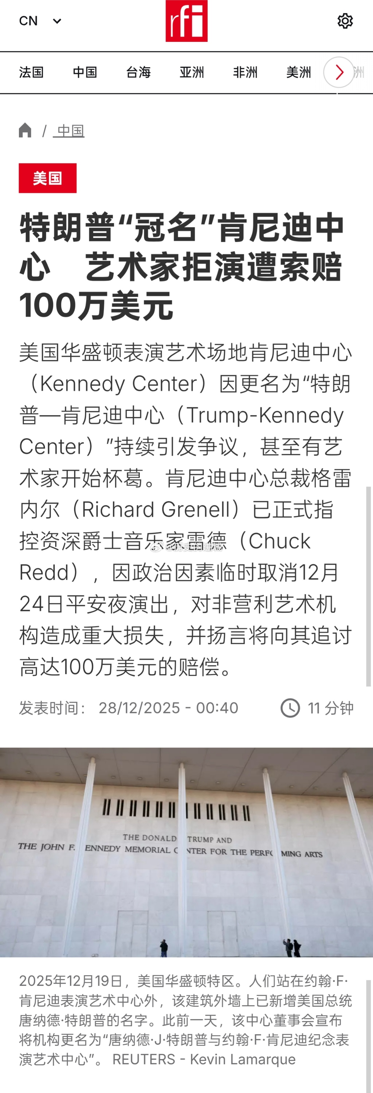 美国华盛顿表演艺术场地肯尼迪中心因更名为“特朗普—肯尼迪中心”持续引发争议,甚至有艺术家开始杯葛。肯尼迪中心总裁格雷内尔已正式指控资深爵士音乐家雷德(Chuck Redd),因政治因素临时取消12月24日平安夜演出,对非营利艺术机构造成重大损失,并扬言将向其追讨高达100万美元的赔偿。