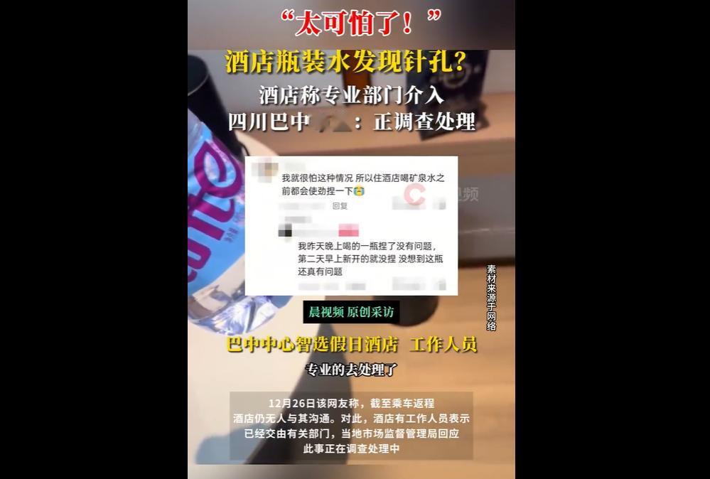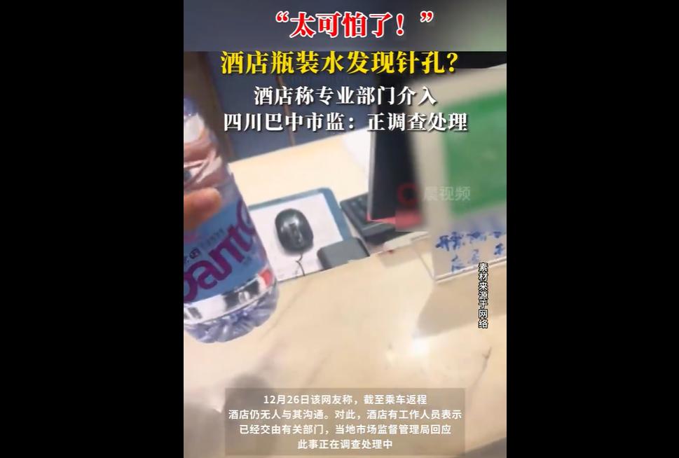 12月24日,网友入住四川巴中智选假日酒店时,发现房间瓶装水疑似有针孔,视频曝光后引发关注。 截至该网友返程,酒店未与其沟通,仅称已交由有关部门处理。目前警方及市场监督管理局均已介入调查,事件正待进一步处理。 酒店瓶装水疑似有针孔,想想都让人后背发凉! 这可不是小瑕疵,而是关乎人身安全的大事——谁知道针孔里有没有被动手脚? 是恶意投毒还是意外破损,细思极恐! 可涉事酒店的操作更让人无语,网友反馈问题后,全程冷漠敷衍,直到人都返程了还没一句沟通,只会甩锅“交给有关部门”,这是不是把消费者的安全当儿戏? 其实,这类酒店瓶装水出现针孔的事件并非个例,此前东莞、青岛等地都曾发生过类似情况,有的是保洁不小心扎破,有的原因不明。 这暴露了酒店行业在用品安全管控上的巨大漏洞:瓶装水从进货、储存到摆放,全程缺乏严格检查,保洁流程也没有规范监管,任由存在安全隐患的物品流入客房,把住客的健康安全抛到九霄云外。