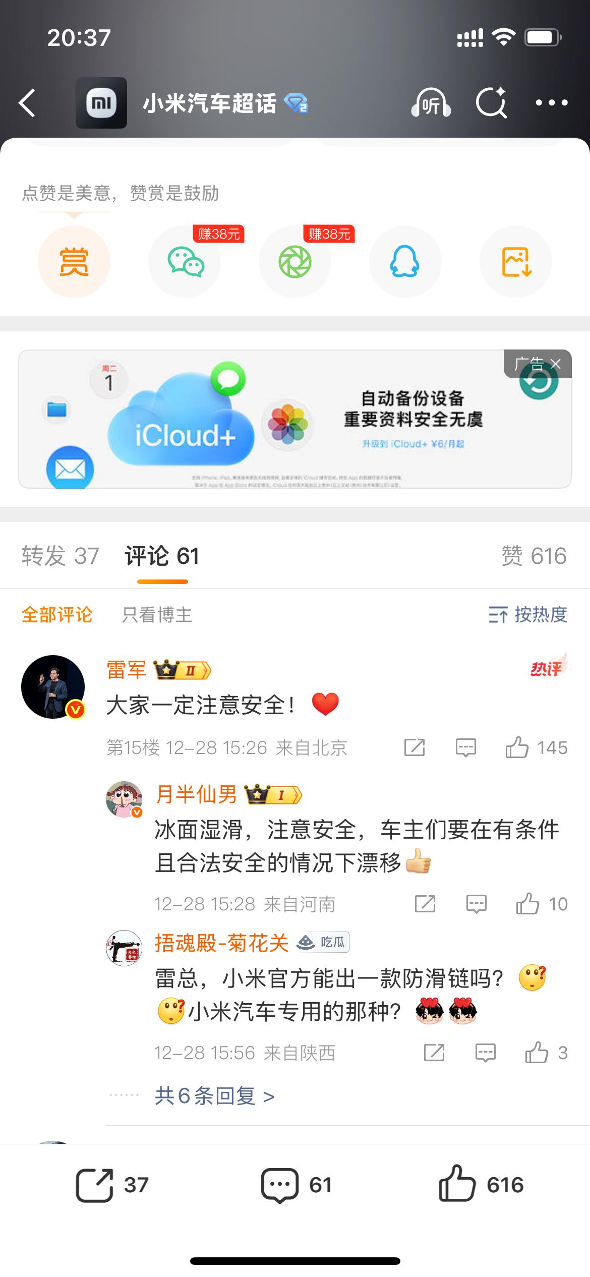 小米到底是招惹谁了?博主发个冰面漂移,还得反复强调是在专业测试场地进行,就怕有人带节奏啊。雷总也是准点提醒大家,一定要注意安全。