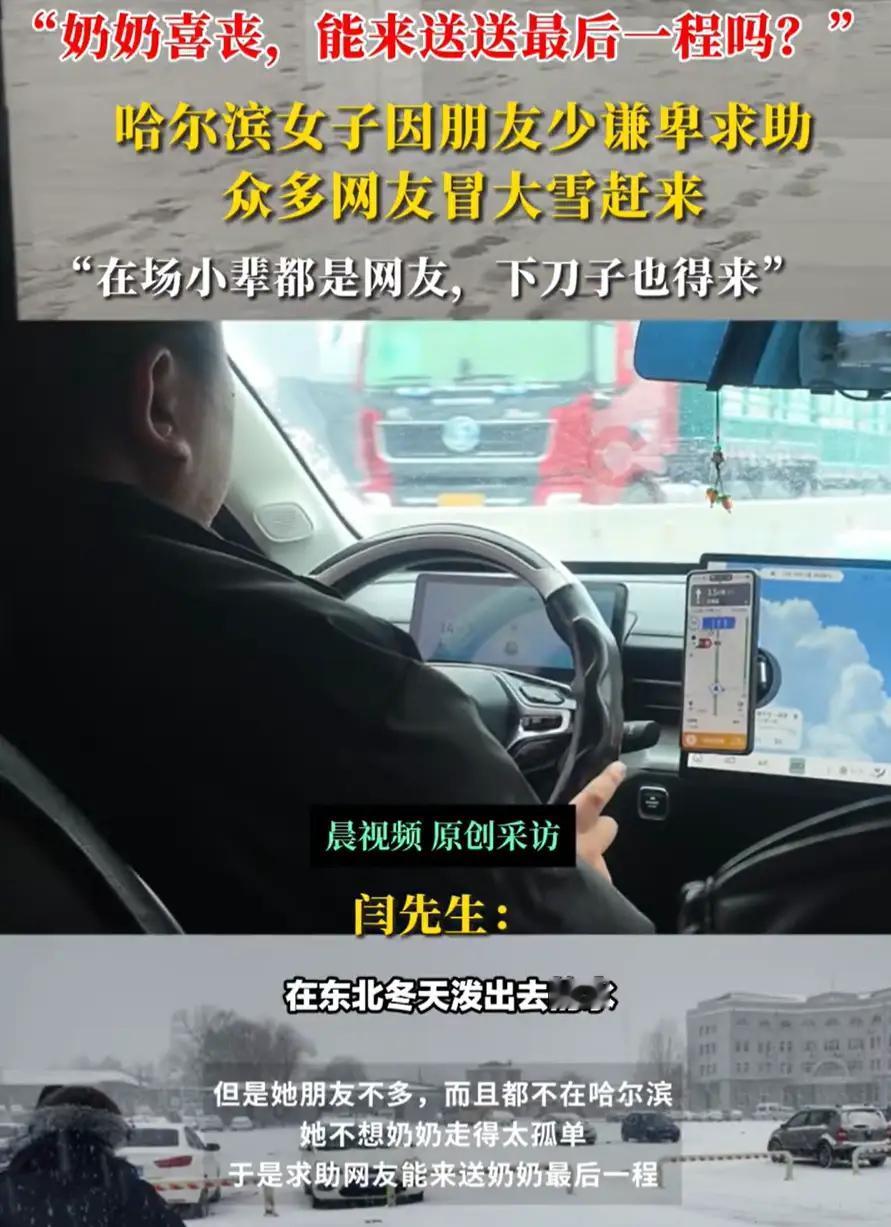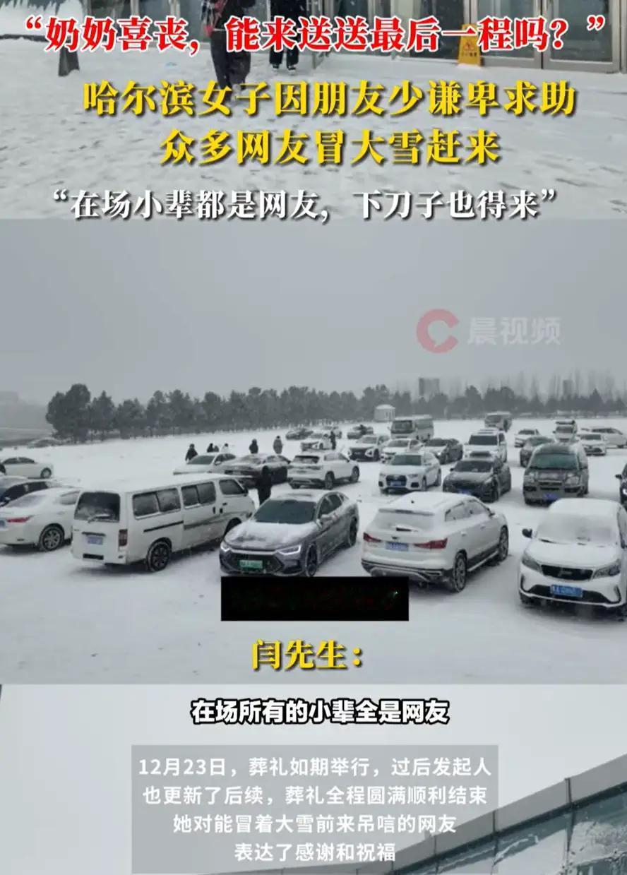 看哭了!黑龙江哈尔滨,一名女生的90岁奶奶去世,因为是喜丧,她希望当天能热闹一点,可自己又没有朋友,于是突发奇想,在网上求助,本以为效果不大,可看到大雪天那么多人前来,甚至还有很多外地游客,女生被感动的不行 看哭了!黑龙江哈尔滨,一名女生的90岁奶奶去世,因为是喜丧,她希望当天能热闹一点,可自己又没有朋友,于是突发奇想,在网上求助。本以为这个请求会像平常一样被冷漠淹没,没想到,却引发了一场温暖人心的奇迹。 那天,大雪纷飞,寒风刺骨,但一场意想不到的“葬礼”变成了人间最温暖的画面。陌生人纷纷赶来,不为别的,只为给那位奶奶最后一程,也为那位女生带去一份难得的温情。这些来自四面八方的陌生人,有的是路过的居民,有的是专程而来的游客,甚至还有来自外地的旅客,他们没有任何预设的目的,只是被那份纯粹的善意打动。 这个故事,像极了我们生活中的点点滴滴:在这个快节奏、功利至上的社会,或许我们都在某个角落等待着一份温暖的回应。那位女生的善意,唤醒了无数人的善良,也让我们重新相信:即使在最冷的季节,爱和关怀依然可以如春天般温暖。 这不仅仅是一场葬礼的“热闹”,更是一场关于人性光辉的展现。它告诉我们,或许我们每个人都可以成为别人的“天使”,只需一点点善意,一次伸出援手的勇气,就能点亮别人的世界。我们是否也可以在生活中多一些理解与包容,少一些冷漠与距离? 这故事背后隐藏的,是我们每个人心底那份未曾泯灭的善良。它让我们反思:在这个世界上,最可贵的不是物质的富有,而是那份能够温暖他人心灵的力量。我们是否还能坚持那份善意?我们是否还能在日常的琐碎中,找到那份令人感动的温暖? 或许,这个冬天最暖的,不是那飘落的雪花,而是我们心中那份不灭的善意火焰。让我们都学会用一颗温暖的心,去照亮身边的每一个人。因为,正是这些微小的善举,构筑起了这个世界最美的风景。 你有没有想过?也许下一次,当你遇到困难或看到别人需要帮助时,也可以像那位女生一样,勇敢地伸出援手。或许,你的一个善意的行动,也能在别人心中点亮一片希望的光。我们都在等待那份温暖,而它,就藏在我们每个人的行动里。老人家的逝世 离世奶奶