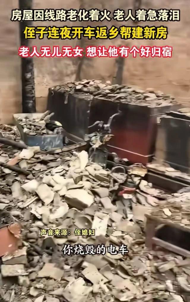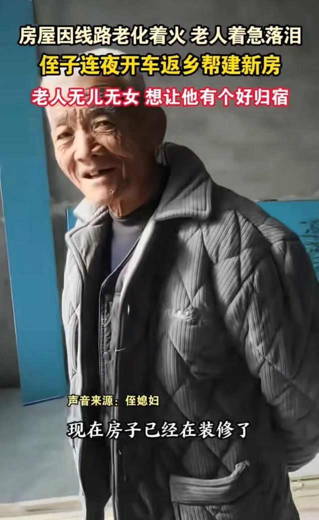 侄子门前站,就不是绝户汉”!河南周口,老人无儿无女,房屋线路着火,老人着急落泪,一夜没睡。侄子听到消息,连夜开车返乡帮建新房!侄子:“他没孩子,我就是他的孩子,想让他有个好归宿!”网友:侄子是好侄子,侄媳妇才是宝! 然而,事情的真相远比表面复杂得多。那位老人,孤身一人,守着那座破旧的房子,眼神中满是孤寂与无助。或许有人会说:“他没有儿女,难免孤单。”但更多的人会思考:在这个快节奏、功利至上的社会里,真正的亲情到底在哪里?是血缘的纽带,还是那份发自内心的关怀与责任? 这场火灾,像是一面镜子,映照出许多家庭的冷漠与疏离。老人无助地站在火光中,泪水模糊了双眼,却也点燃了旁人的良知。侄子深夜赶回,带着满满的责任感和温暖,想为老人撑起一片天。有人说:“侄子是好侄子,值得敬佩。”但我想问:在这个社会,多少人还愿意为了亲情放下手中的繁忙?又有多少人会在关键时刻挺身而出?这不仅仅是一个家庭的故事,更是一面折射社会良知的镜子。 我们常常被“血缘”这个词束缚,却忽略了“责任”和“关爱”的力量。有人说:“侄媳妇才是宝。”没错,家庭的温暖,不仅仅来自血缘,更来自日常点滴的关心和陪伴。一个懂得珍惜、懂得付出的家庭,才是真正的幸福源泉。 这个故事,让我想起许多被忽视的角落:那些孤寡老人、空巢家庭、甚至身边默默付出的“普通人”。他们的生活,也许没有轰轰烈烈的戏码,但他们的坚守与善良,却温暖了整个社会。 我们每个人都可以是那位侄子,也可以成为那位老人。只要多一点关心,少一点冷漠,就能让这个社会变得更加温暖。毕竟,真正的幸福,不在于拥有多少,而在于我们能为他人做些什么。让我们都成为那份温暖的传递者,用行动去证明:在这个世界上,没有什么比真情更珍贵。 所以,朋友们,下次遇到需要帮助的人,不要犹豫。也许,你的一个善意的举动,就能点亮别人的生命,温暖一颗孤寂的心。让我们用行动告诉这个世界:人间有真情,社会有温度。老家侄子 无子绝户