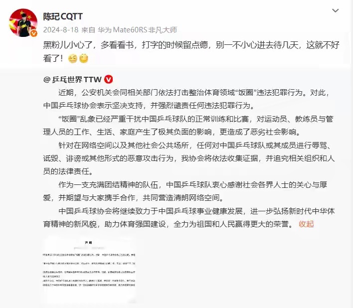12月28日,前乒乓球奥运冠军、现任江苏乒乓球队总教练陈玘发文,怒斥收到包含死亡威胁的私信,直言对方“丧心病狂”!陈玘曾在2024年8月转发整治体育领域饭圈违法犯罪的声明,提醒黑粉谨言慎行,此次遇恐吓引发网友对网络暴力的声讨。