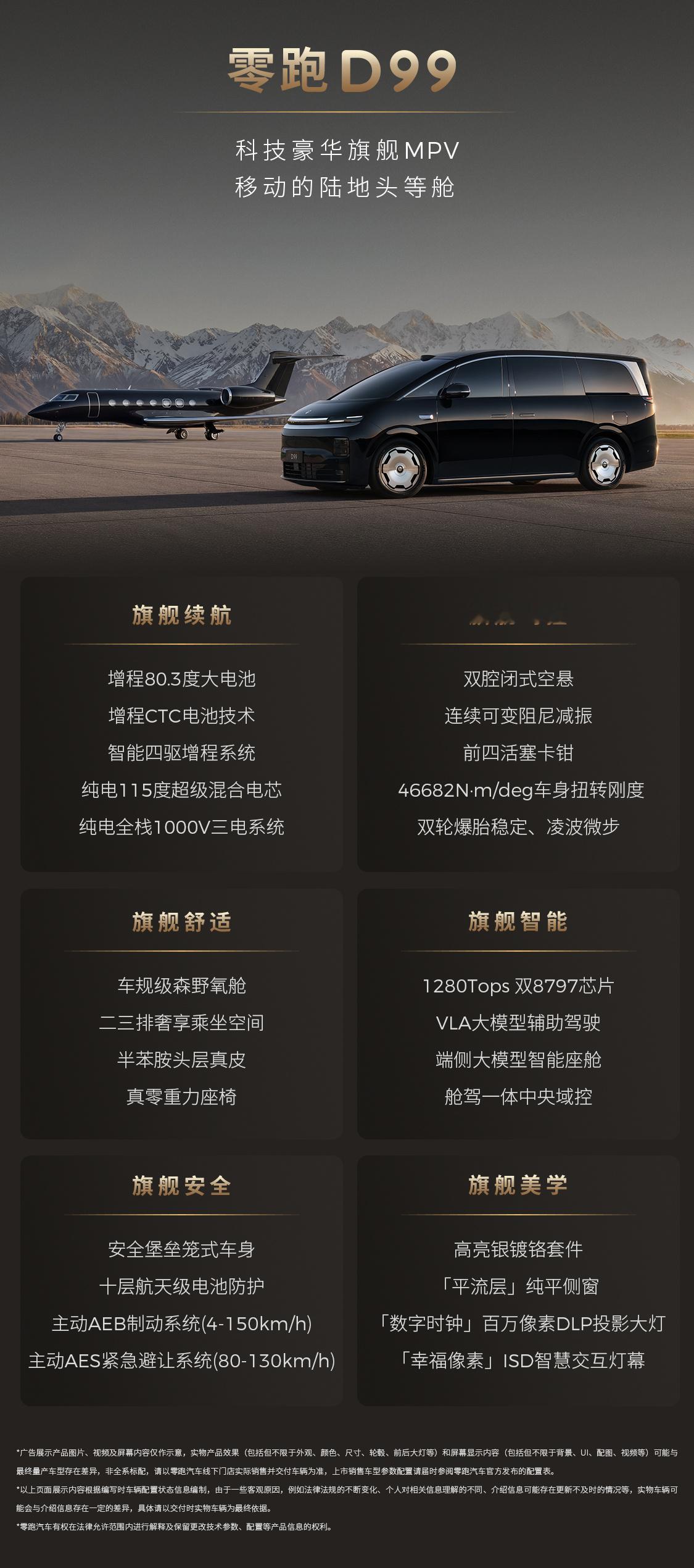 零跑汽车十周年发布会刚刚结束了,跟大伙简单聊聊~会上发布了零跑D19,这车外观上,科技自然美学2.0、5款配色可选。续航方面,增程版500km纯电续航、800V高压增程平台,纯电版720km纯电续航、1000V三电系统。智能化方面,双8797芯片、VLA辅助驾驶系统。安全方面,主动AEB制动、AES避让,十层航天级电池安全堡垒。还发布了零跑D99,这是零跑的首款MPV。续航方面,增程版80.3度大电池、增程CTC电池技术,纯电115度超级混合电芯、全栈1000V三电系统。驾控方面,双腔闭式空悬、连续可变阻尼减振。智能化方面,双8797芯片、VLA大模型辅助驾驶。安全方面,主动AEB制动、AES避让等。其他详细的可以看图。零跑9系豪华双旗舰同台首秀