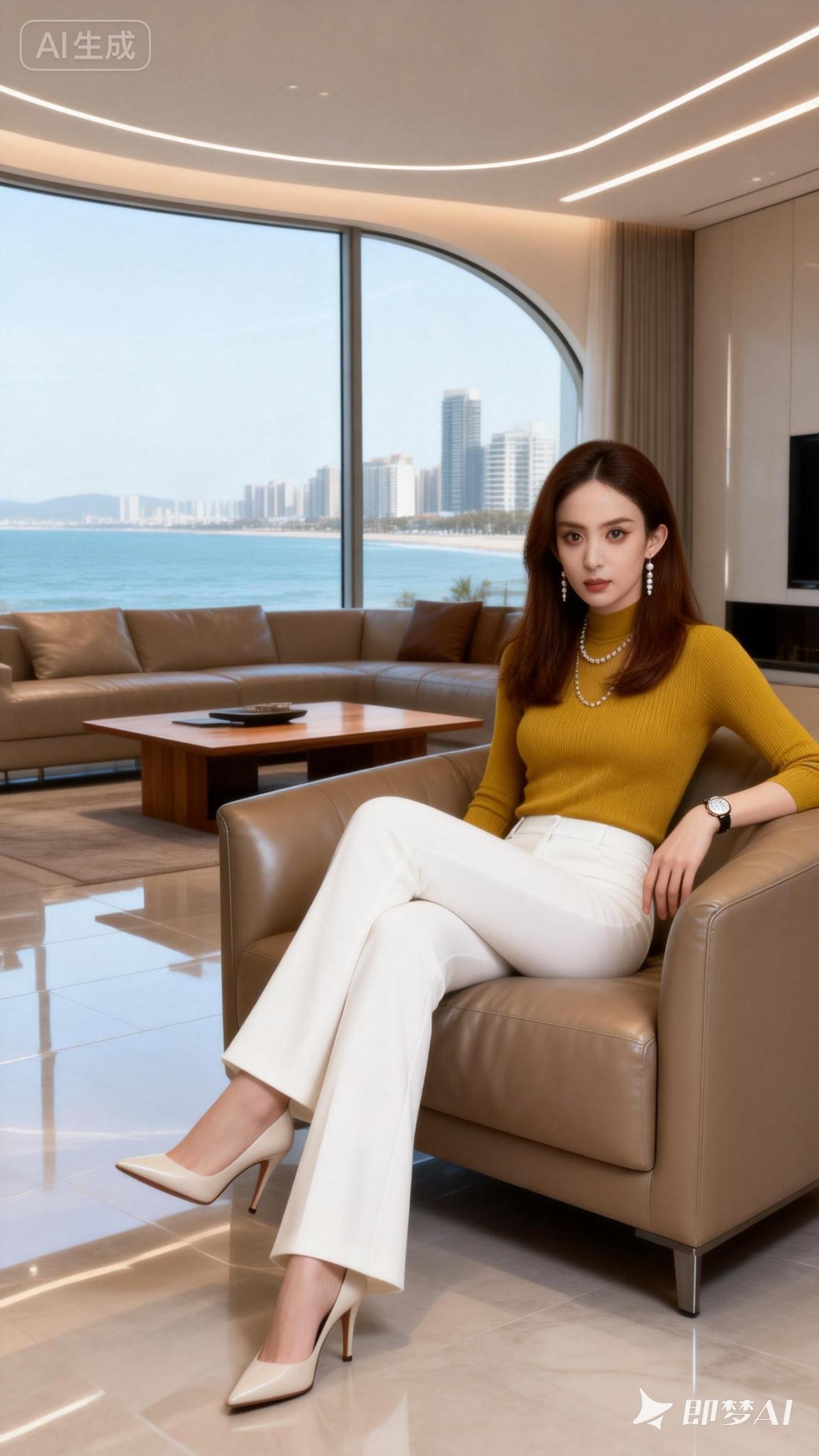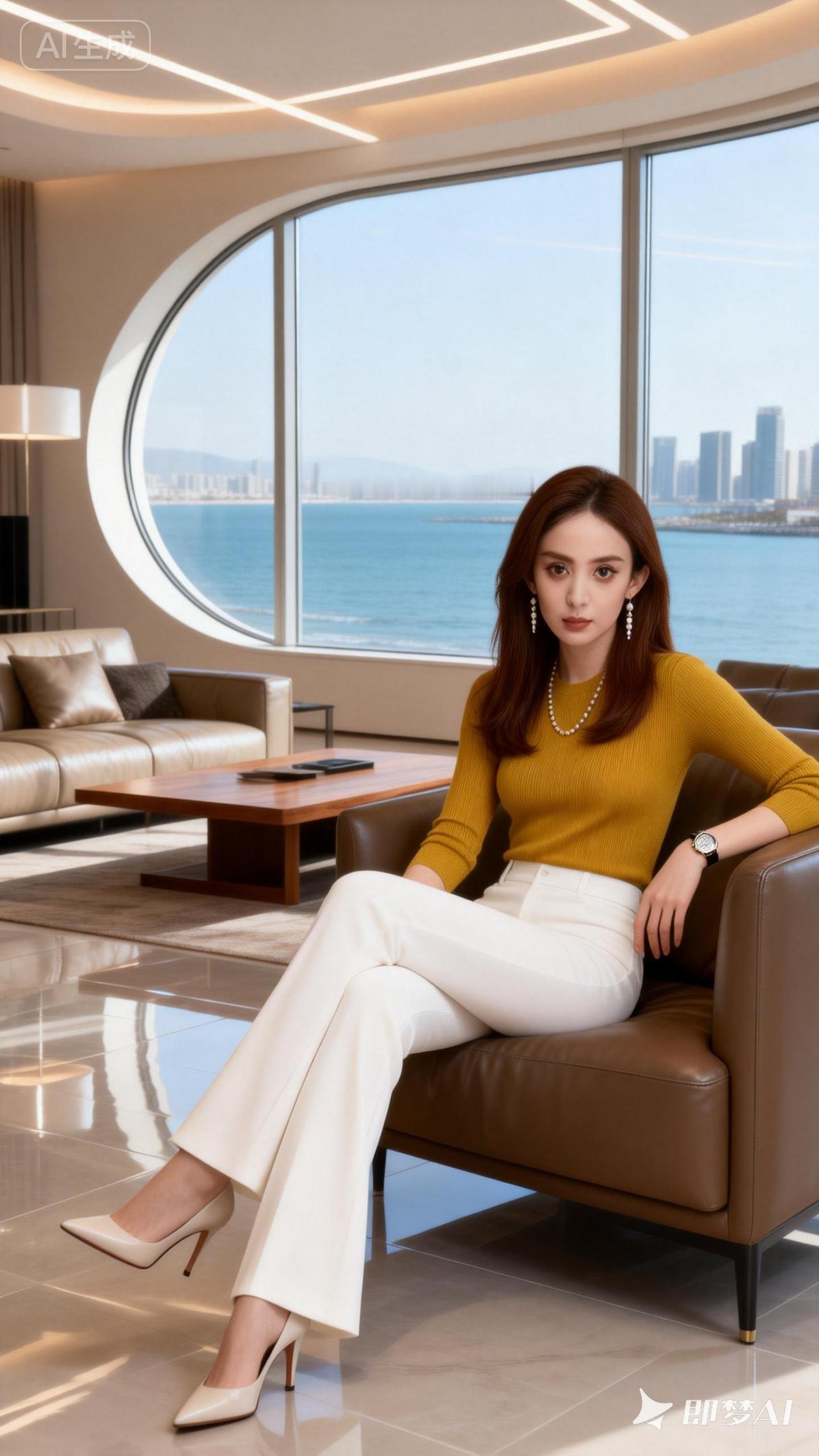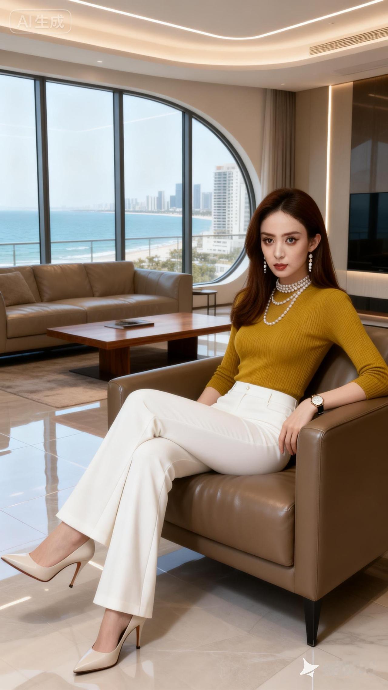 现代都市雅致生活,时尚穿搭与海景相映成趣。