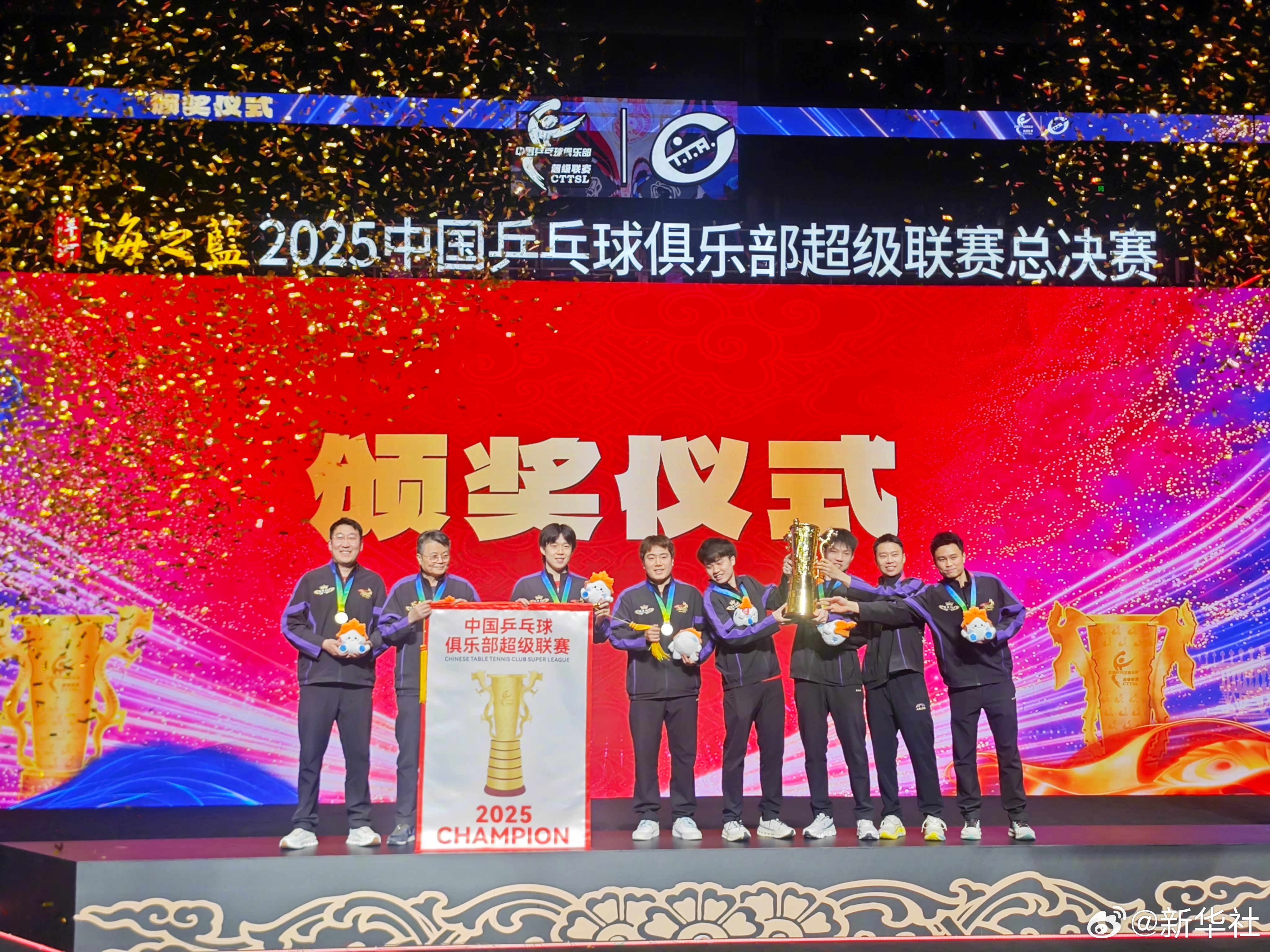 【#山东魏桥捧杯瞬间#】乒超联赛男团决赛, 、、等所在的山东魏桥·向尚运动队3比0黄石华新队夺冠。颁奖仪式山东魏桥的队员教练们捧起冠军奖杯。(记者:夏鹏)