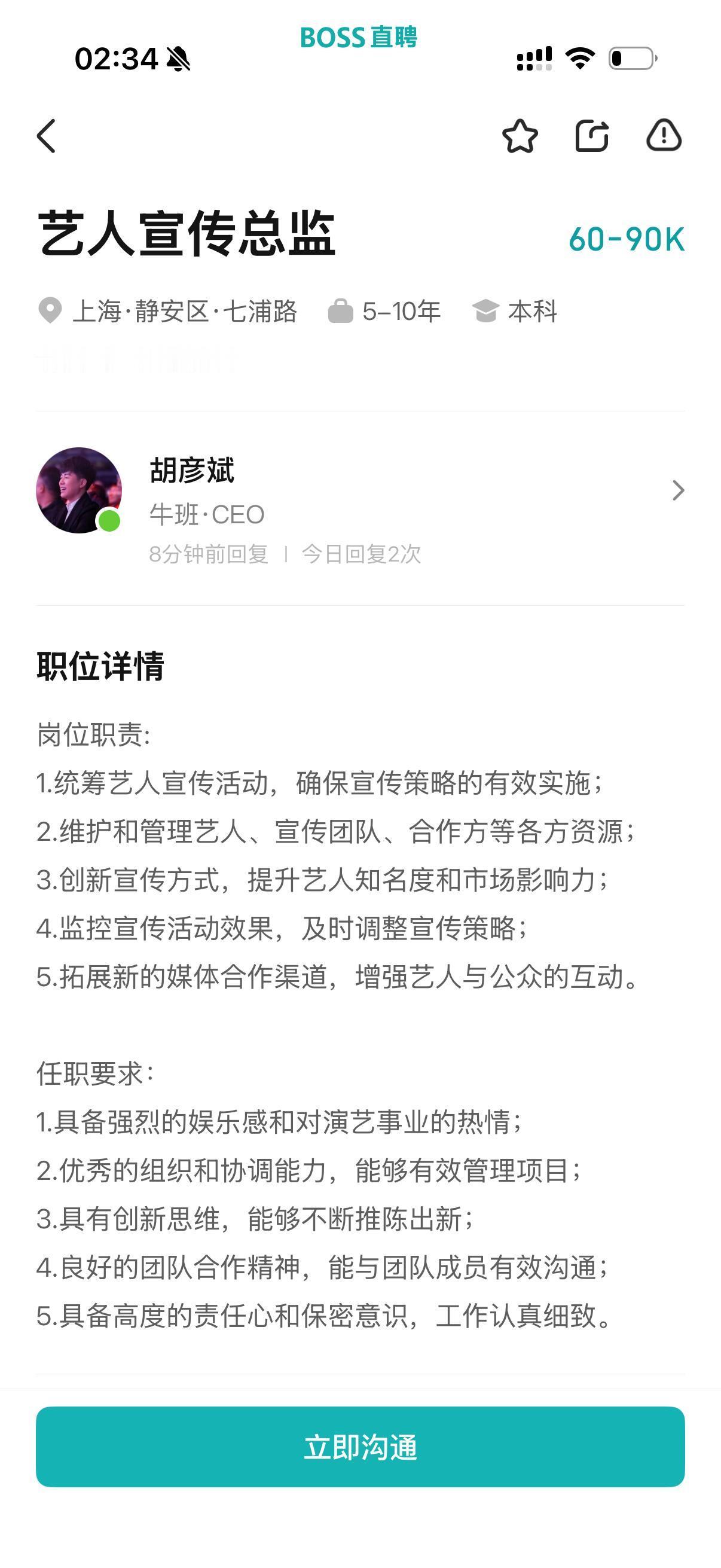 胡彦斌原来你是真的boss直聘,8分钟前还在回,他不会要亲自面试吧