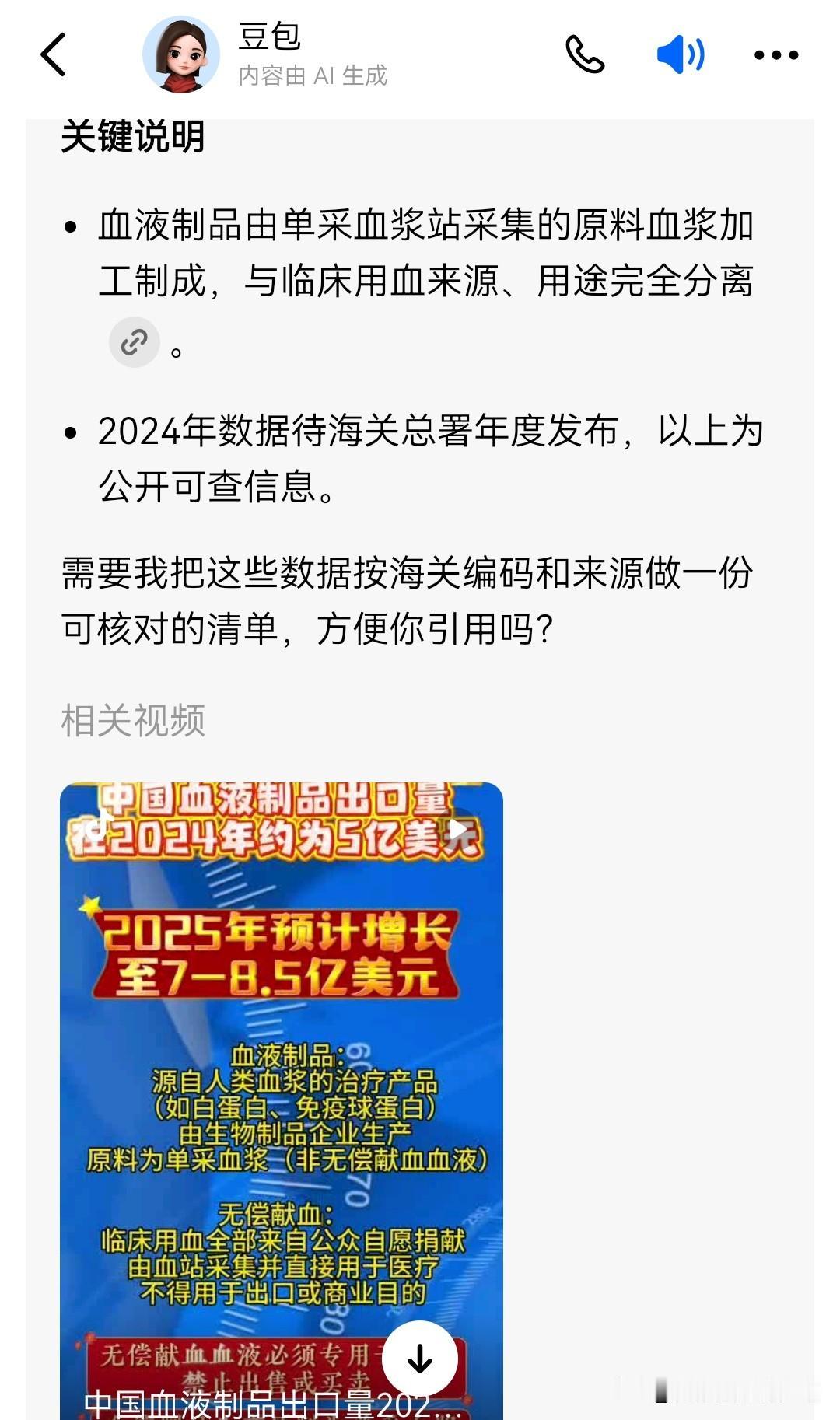 最近社区动员我献血,说献血有益身体健康,还送两个面包,家人用血还可以免费。我就闲了没事问问豆包,我怕自己两个面包送的400ml又成了有些人的香饽饽。豆包把最近五年的数据给我快速汇总了,告诉我2024年资料缺失。我又查了别的资料,说2024年各地血库告急。我现在有点糊涂了,我们无偿献血禁止出口,我们又禁止有偿卖血,我们出口的这些血液制品到底是人血还是动物的血。这一年几百吨,拉过去估计要用火车皮吧,货运太贵了。