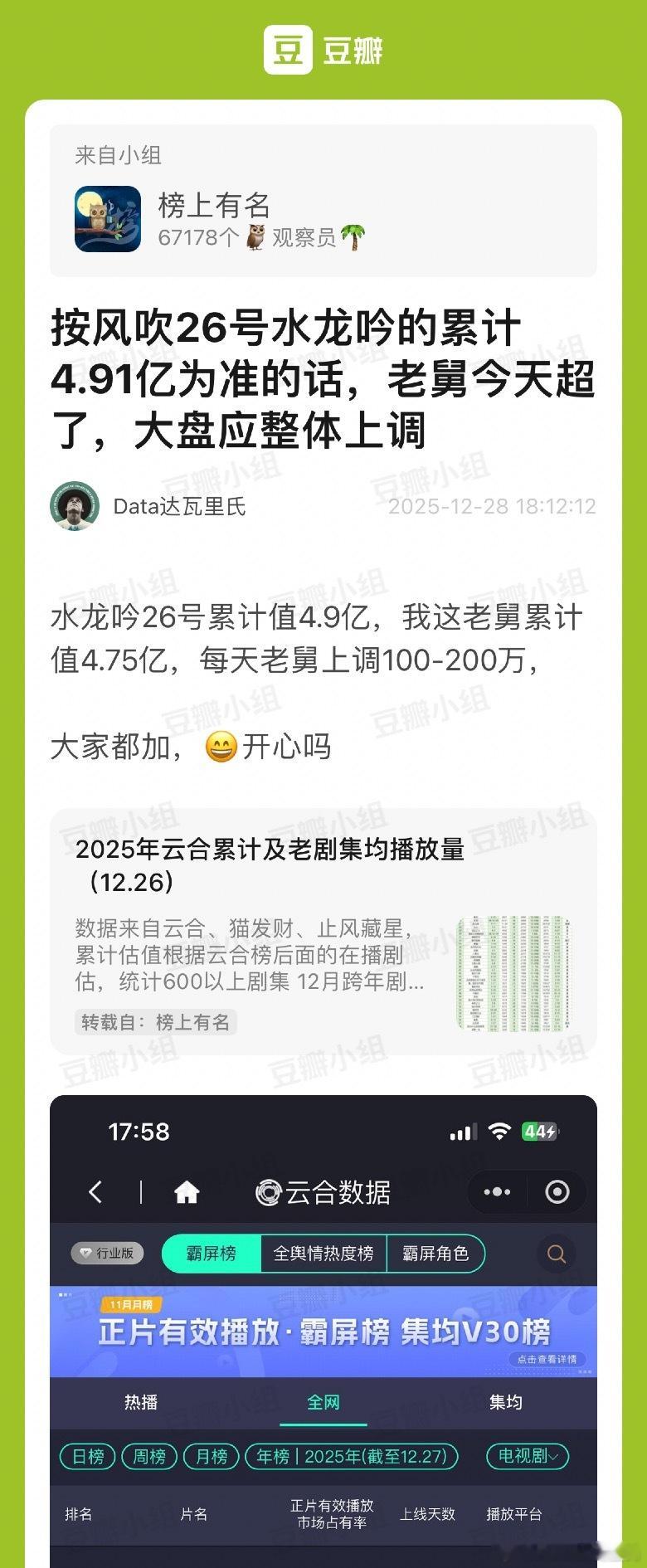 水龙吟26号云合累计值4.91亿,我这边老舅累计值4.75亿,每天老舅上调100-200万,大盘必然也加,大家都加,😄开心吗