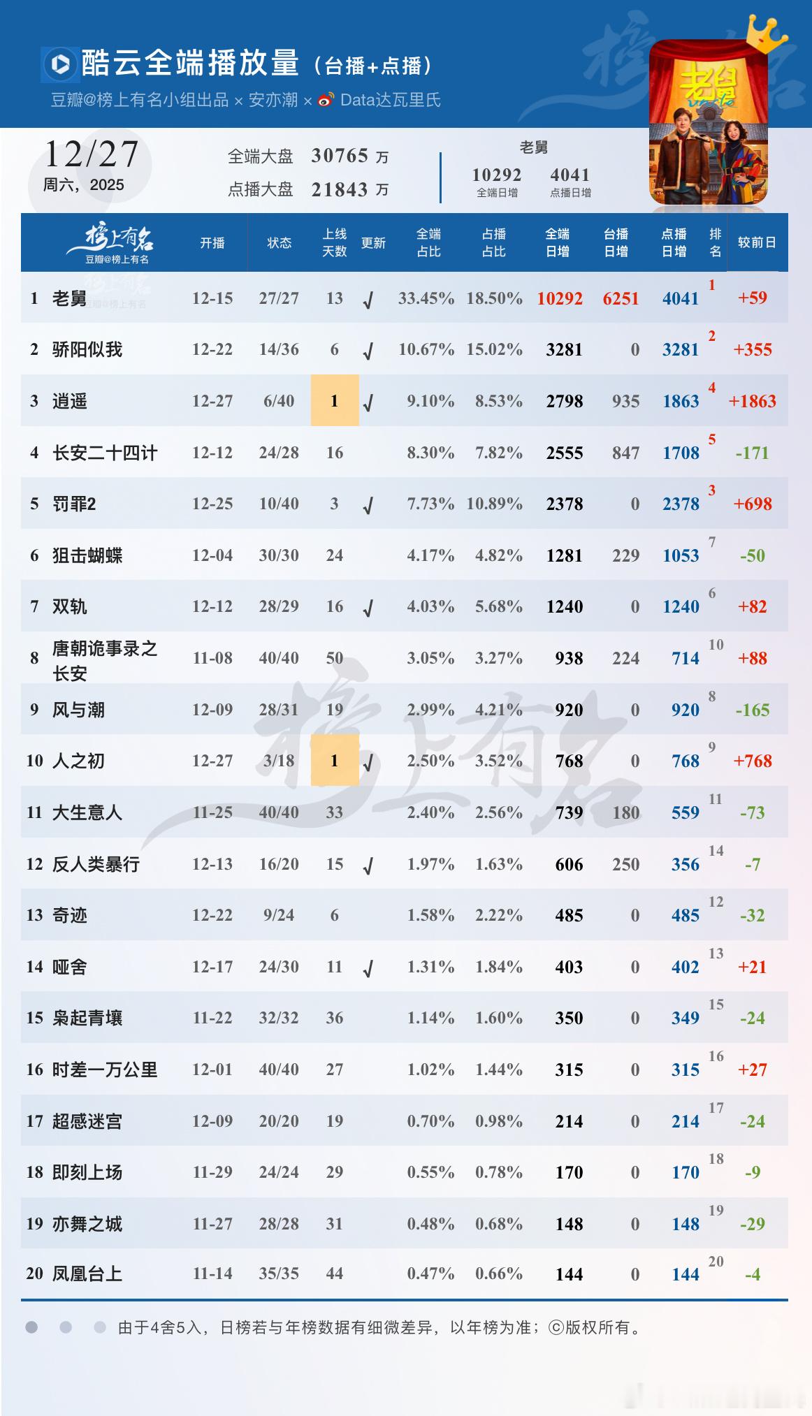 12.27酷云播放量🌴豆瓣榜上有名小组出品1 老舅 VIP收官全端破亿❗️ 2 骄阳似我 破3000万了 3281 +3553 逍遥 2798 点播1863高开 4 长安二十四计 2555 1708 -1715 罚罪2 第三天 2378 涨+698走势良好🛫6 狙击蝴蝶 1281 1053 -507 双轨 1240 +828 唐朝诡事录之长安 938 714 +889 风与潮 920 -16510 电视剧人之初 首播 768 11 大生意人 12 反人类暴行 13 奇迹 14 哑舍 15 枭起青壤 16 时差一万公里 17 超感迷宫 18 即刻上场 19 亦舞之城 20 凤凰台上 逍遥数据 ,人之初数据人之初数据