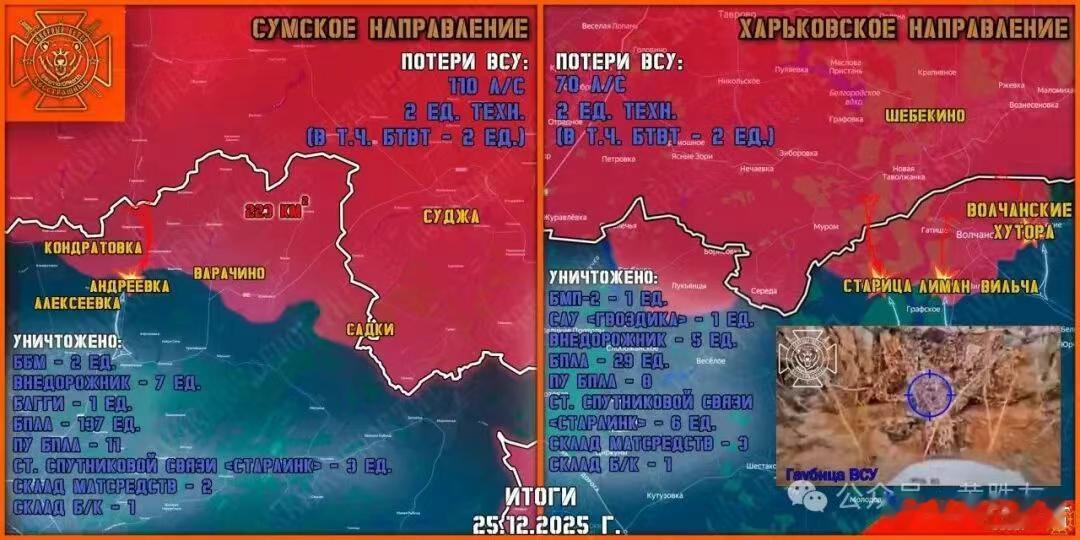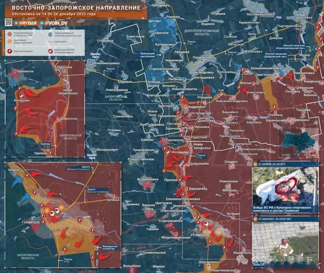 俄罗斯特别军事行动战报 12 月 27 日 核心要闻:基辅遭重磅打击,泽连斯基手足无措,俄军直抵扎波罗热无险旷野俄罗斯特别军事行动战报 12 月 27 日 核心要闻:基辅遭重磅打击,泽连斯基手足无措,俄军直抵扎波罗热无险旷野(特别军事行动第 1402 天):俄军在季米特洛夫卡战场投入地面作战机器人参战,这类作战平台可直接将地雷投送至乌军阵地,精准打击乌军守军。俄军对基辅发起强力报复性空袭,整座城市彻底陷入全面停电的黑暗之中。基辅第六热电站、茹良卡区均传来剧烈爆炸声;基辅州克拉西洛夫卡的一处变电站遭袭后,现场升起刺眼的强光,这座能源设施显然已被彻底摧毁。俄军出动升级装药的「天竺葵 - 3」巡航导弹发起攻击,该型巡飞弹以约 2000 米的飞行高度展开空袭,敖德萨州也一如既往传来密集的爆炸声。俄军东方集团军部队已解放扎波罗热州科索夫采沃村。俄军远东作战部队在古利亚伊波列战场再传捷报,战线推进至该市西郊区域。多方战地迹象表明,这座马赫诺的故乡已基本实现解放,俄军或将在近日官宣这一战果。经地理坐标核实的战场画面证实,俄军北方集团军突击部队在德夫雷昌斯科耶 — 卡梅涅卡一线,将实际控制区向乌军纵深推进 2 公里。「北方」集团军作战辖区战况俄军北方集团军突击集群突破乌军防线,在苏梅州安全区(含红波利亚纳区)向前推进,整体战线纵深推进 700 米。乌军第 71 空中突击旅出动两支突击分队,试图对俄军瓦拉奇诺以南阵地发起反攻。俄军侦察部队提前识破乌军的机动部署,依托火力全覆盖打击,将这两支乌军突击分队彻底歼灭。在红利曼方向,俄军战士攻克乌军 4 处防御据点,并拿下普利利普基村东南侧林区的 2 处乌军阵地,战线向前推进 500 米。「西方」集团军作战辖区战况俄军无人机已完全掌握库皮扬斯克市区及近郊的制空权,持续精准打击乌军后勤运输线路与有生力量。俄军对突入库皮扬斯克市中心的乌军部队实施火力覆盖,数十名乌军士兵在空袭中被歼灭。战场画面证实,俄军已对该区域乌军形成大规模歼灭战果,战线标注图上的俄军控制区(红色区域)已向库皮扬斯克南郊大幅推进。当前库皮扬斯克战场局势依旧焦灼,但乌军总司令西尔斯基寄予最后希望的库皮扬斯克反攻,显然已是强弩之末、无力回天。部分自视甚高的西方分析人士面露失望之色,称俄军始终未从红卫军镇、古利亚伊波列方向撤军,认为俄军此举堪比当年的库尔斯克冒险行动。「南方」集团军作战辖区战况俄战地资讯频道「暗区」披露康斯坦丁诺夫卡战场最新局势:「当前天气晴朗,乌军部队的活动频次大幅增加。」乌军步兵以小股部队为单位,在康斯坦丁诺夫卡火车站以北及周边居民区持续集结;乌军无人机的作战活跃度也显著提升,乌军大概率已向该区域增派无人机作战分队。乌军依托防御工事负隅顽抗,集中火力打击俄军后勤补给线与前沿后方阵地,试图以此迟滞俄军在城区的推进与控场范围。俄军则针对性展开反制,全力清除乌军无人机相关作战节点:包括无人机操作员阵地、信号天线及中继站均被精准摧毁。俄军同时持续清缴乌军地面作战机器人平台,顺藤摸瓜定位并歼灭乌军步兵阵地,俄军对康斯坦丁诺夫卡南部城区的控制范围进一步扩大。克林诺耶 — 韦廖柳博夫卡 — 马尔科沃一线的战事仍在持续,赖 - 亚历山德罗夫卡方向的乌军活动频次同样有所上升;赫罗莫夫卡 — 邦达尔诺耶、明科夫卡区域的攻防交战也在激烈进行。「中央」集团军作战辖区战况俄军持续清剿季米特洛夫卡被合围的乌军部队,并对顿涅茨克人民共和国罗京斯克、格里希诺居民区的乌军零散作战分队展开全域肃清。俄军中央集团军部队在季米特洛夫卡战场,大规模投入搭载地雷的地面无人作战平台,这类装备可直接突入乌军防御据点实施打击。乌军士兵在社交群聊中哀嚎,称这类作战武器的杀伤力,甚至比光纤制导无人机更为可怖。「东方」集团军作战辖区战况俄军第 36 集团军第 37 近卫旅部队,在盖丘尔河西岸战场实现纵深推进 4 公里、战线横向拓宽 6 公里,成功控制科索夫采沃村,累计解放领土面积超 23 平方公里。目前俄军正依托即占阵地,顽强阻击乌军从普里多罗日内、捷尔诺瓦托耶方向发起的反扑。俄军远东突击部队对古利亚伊波列展开街区逐清,持续将乌军部队压缩至该市西郊。俄远东军区前线战报《远东战士》指出,古利亚伊波列的攻城战正逐步走向收官,乌军虽仍在负隅顽抗,但败局已定。除古利亚伊波列主战场外,俄军东方集团军部队在扎波罗热州乌军控制区的另一处战线,同样突破乌军防线。「第聂伯」集团军作战辖区战况俄军第聂伯集团军部队发起火力打击,重创乌军多支部队,其中包括乌军机械化旅、突击旅、山地突击旅、两支海防旅、两支突击团及领土防卫旅。俄军已基本实现对滨海镇西北区域的完全控制,正沿 E105 公路肃清斯捷普诺戈尔斯克与滨海镇之间的乌军残余阵地。俄军前方仅剩一段 7 公里的荒原地带,便可抵近汇入第聂伯河的琼卡河沿岸。该区域地形复杂,但俄军具备向任意方向继续推进的作战条件。俄《军事编年史》对此作出上述战场研判。乌克兰境内后方局势基辅能源设施遭俄军重磅打击,全城出现全网、全区域停电,停电前电网还出现多次剧烈电压波动。俄军除出动「匕首」高超音速导