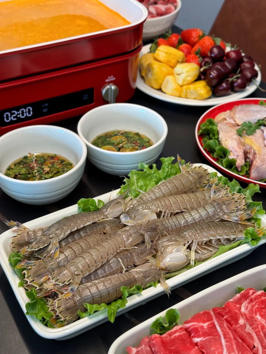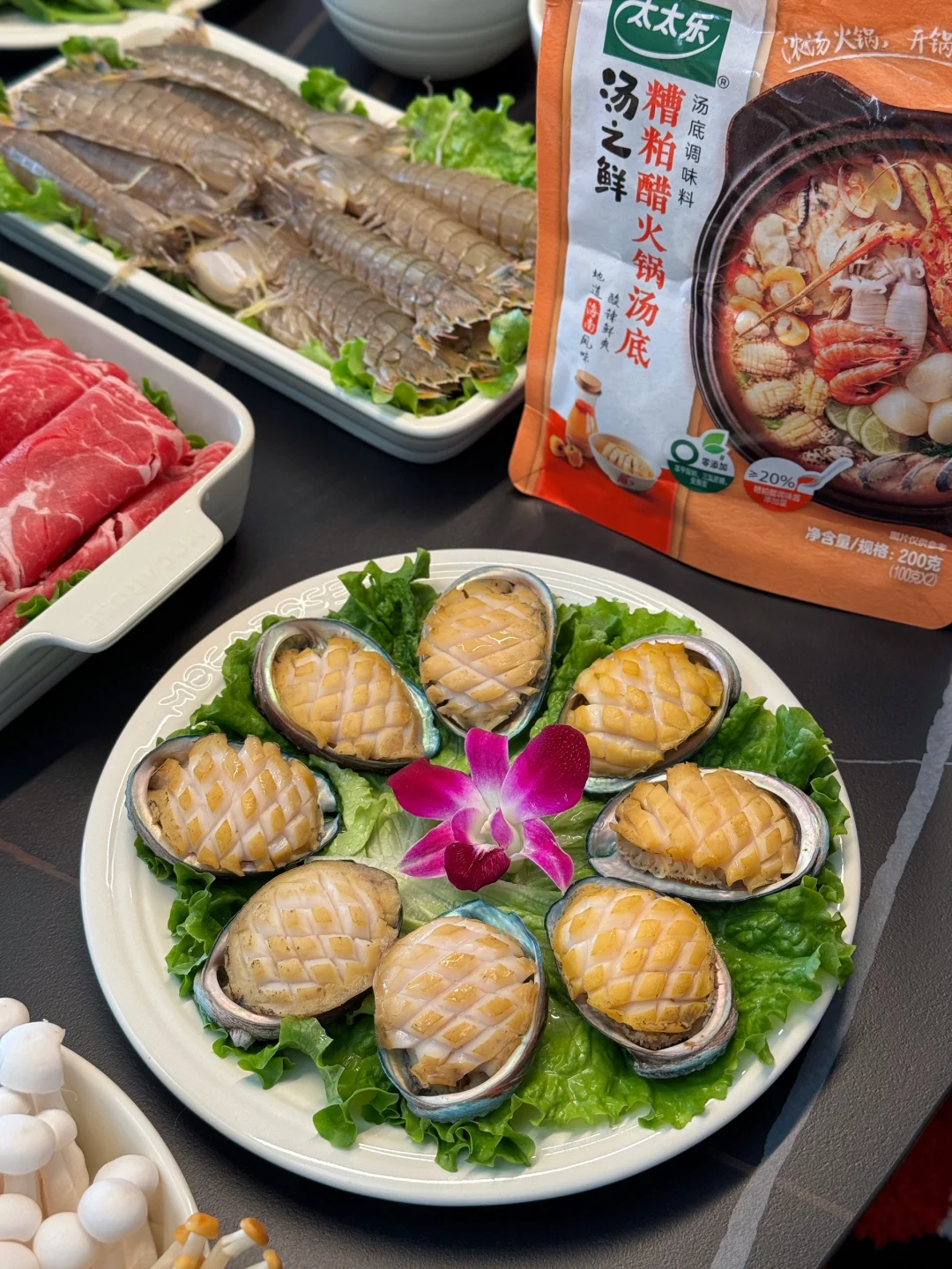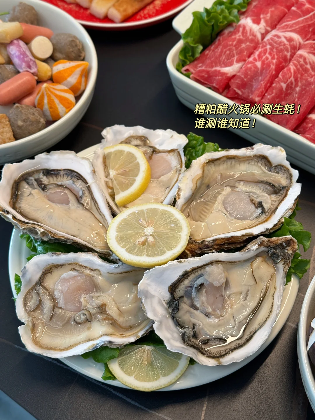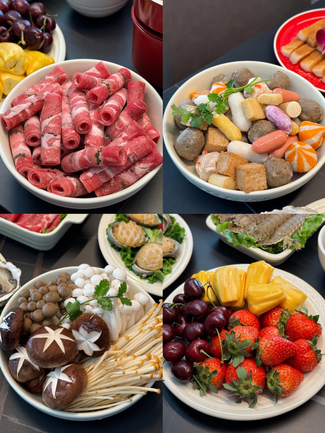 生蚝、鲍鱼、皮皮虾、鸡块、肥牛卷、沙葱牛肉卷、火锅丸子,蔬菜拼盘、菌菇拼盘、豆腐、红糖糍粑