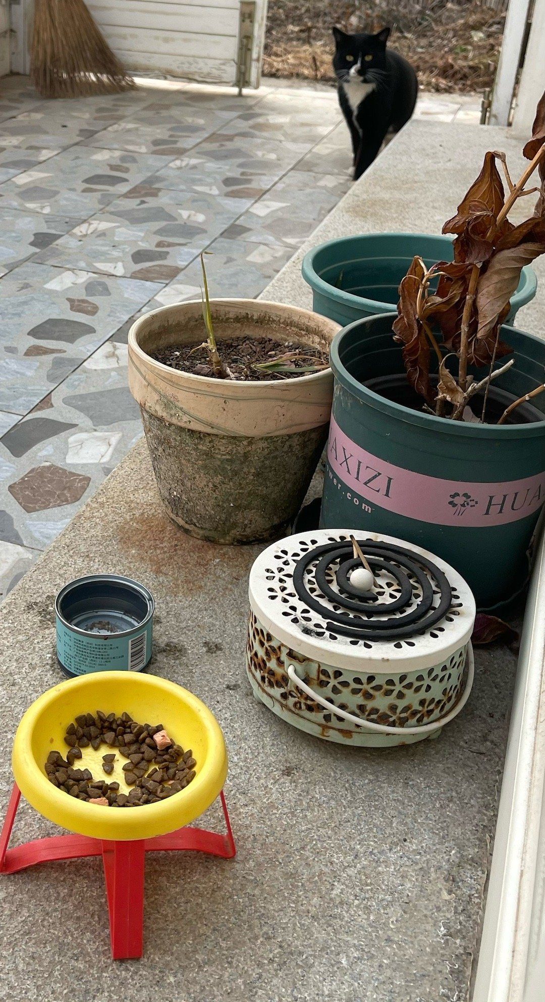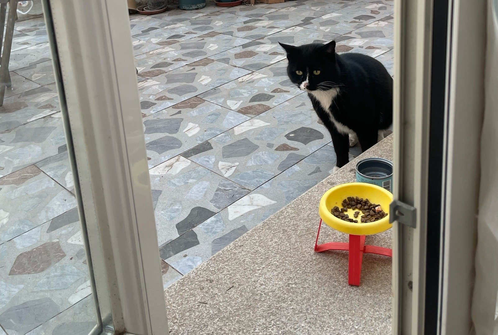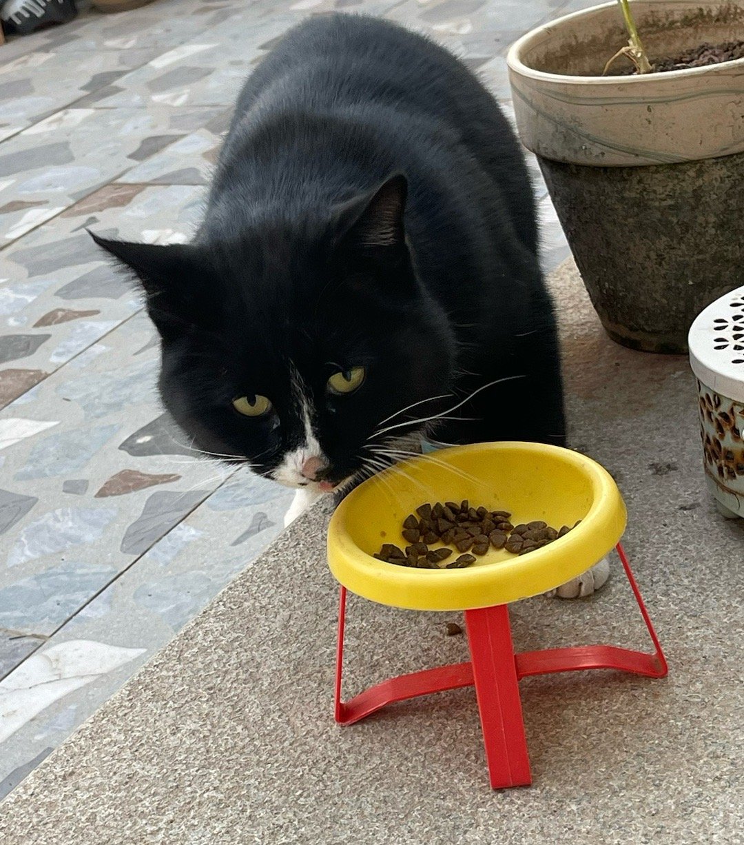 我家猫咪小饭桌好像来了第十二位客人。这只大黑猫上周第一次见,当时是看到一个背影,很快跑了。今天下午又来了,我喂了它3碗猫粮,它看出了我的善意,我可以比较近距离地观察它了。它很干净,毛发也很有光泽,不像流浪猫。介于亲人和不亲人之间。不知是跑丢的,还是被人刚遗弃的。冬天遗弃猫,是最没有人性的。最后一图是刚喂的第四碗……不知道它饿了多久,饭量那么大。