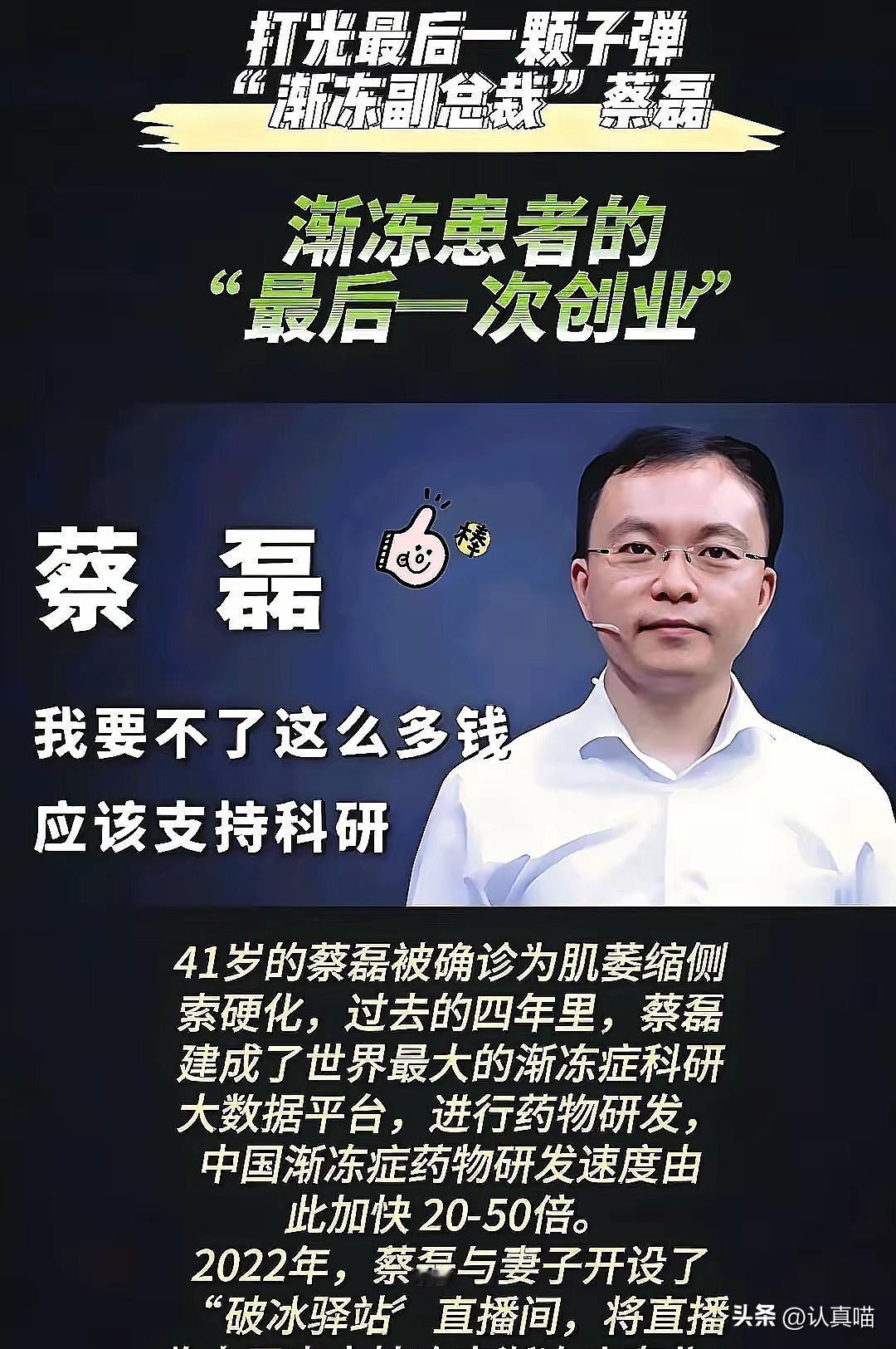 谁懂啊! 看到渐冻症药物突破的消息, 第一反应就是替段睿狠狠松了口气!这六年的苦,真不是常人能扛的。 蔡磊确诊时被下了“三到五年”的死亡判决,两口子愣是砸进去一个多亿,段睿放下事业转行直播带货,还被喷“瞎折腾”“填无底洞”。他们没辩解,只是把带货收入全投科研,用眼控仪敲方案、建样本库,终于把罕见病科研的死路开了出来。 现在20多岁的患者靠新药恢复正常生活,单基因渐冻症被攻克,蔡磊和段睿证明了,所谓奇迹,从来都是不认命的人拼出来的。