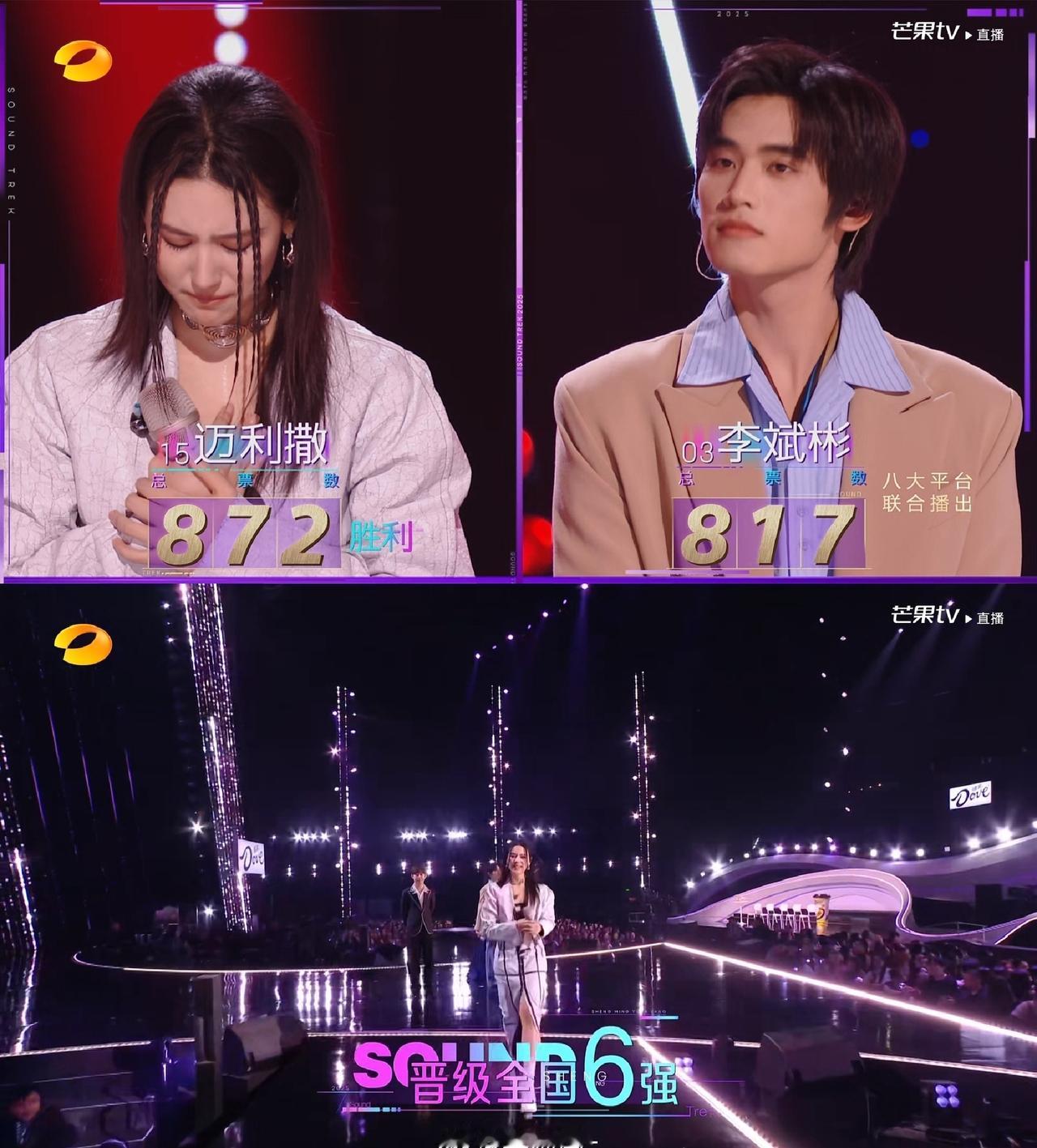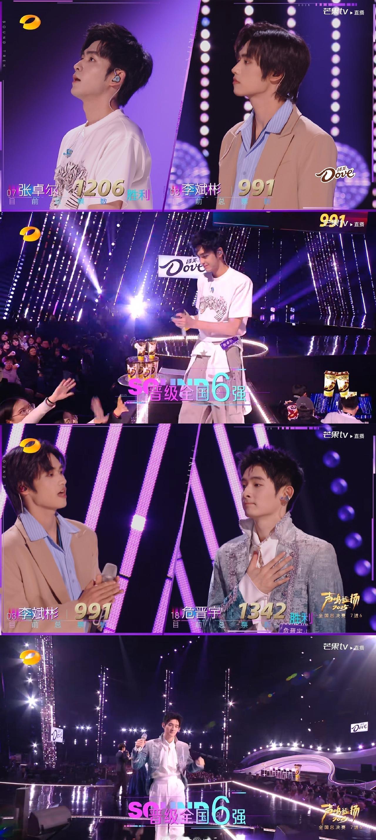 湖南卫视超话 声鸣远扬六强 第一轮 迈利撒 PK 马韬 票数:873:1347 马韬进入全国六强 迈利撒进入第二轮 高旭 PK 张卓尔 票数:1229:1206 高旭进入全国六强 张卓尔PK生特吾姬 票数:1206:1383 生特吾姬进入全国六强 张卓尔PK李斌彬 票数:1206:991 张卓尔进入全国六强 李斌彬PK危晋宇 票数:991:1342 危晋宇进入全国六强 李斌彬进入第二轮 至此马韬 高旭 张卓尔 生特吾姬 危晋宇进入全国六强 第二轮 迈利撒 PK 李斌彬 票数:872:817 迈利撒进入全国六强 本场淘汰李斌彬 《声鸣远扬 》 周日13:30 声超开放日 周日19:30直播