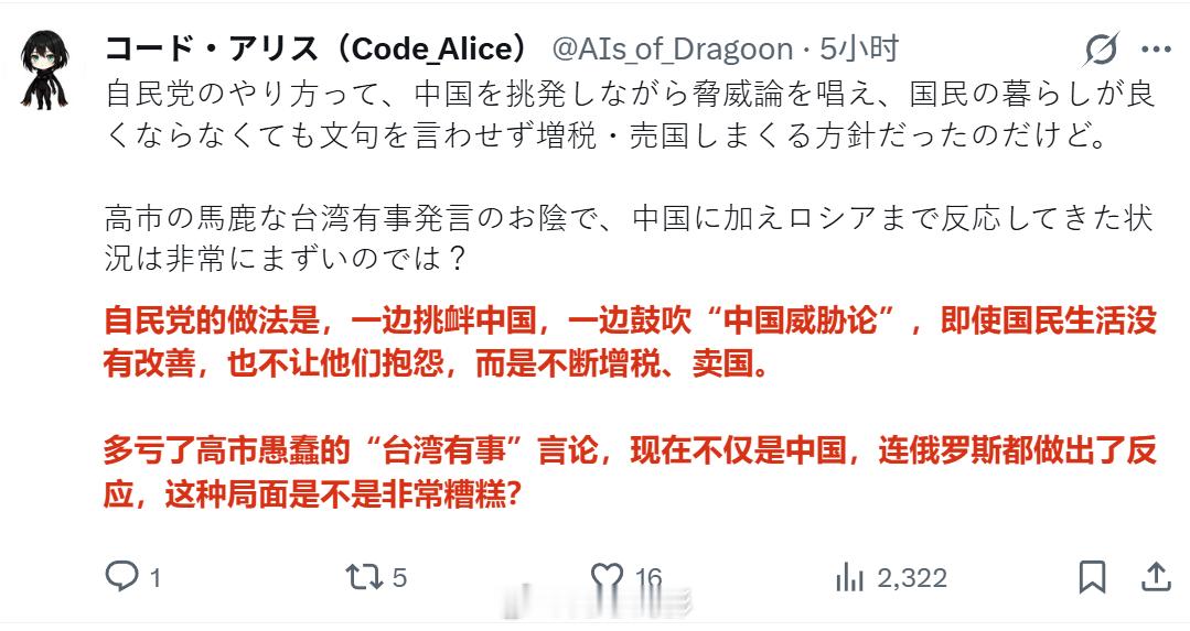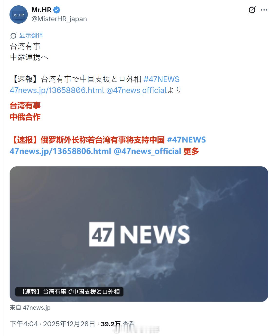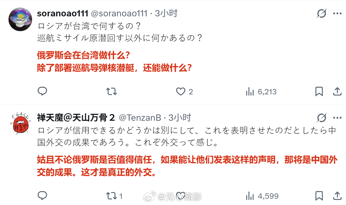俄罗斯外长拉夫罗夫表示:若台海局势升级 俄罗斯将支持中国反对任何形式的“台独”。此话一出,小日子们发现“台湾如果真有事,我们就被中俄朝包围啦~”海外新鲜事