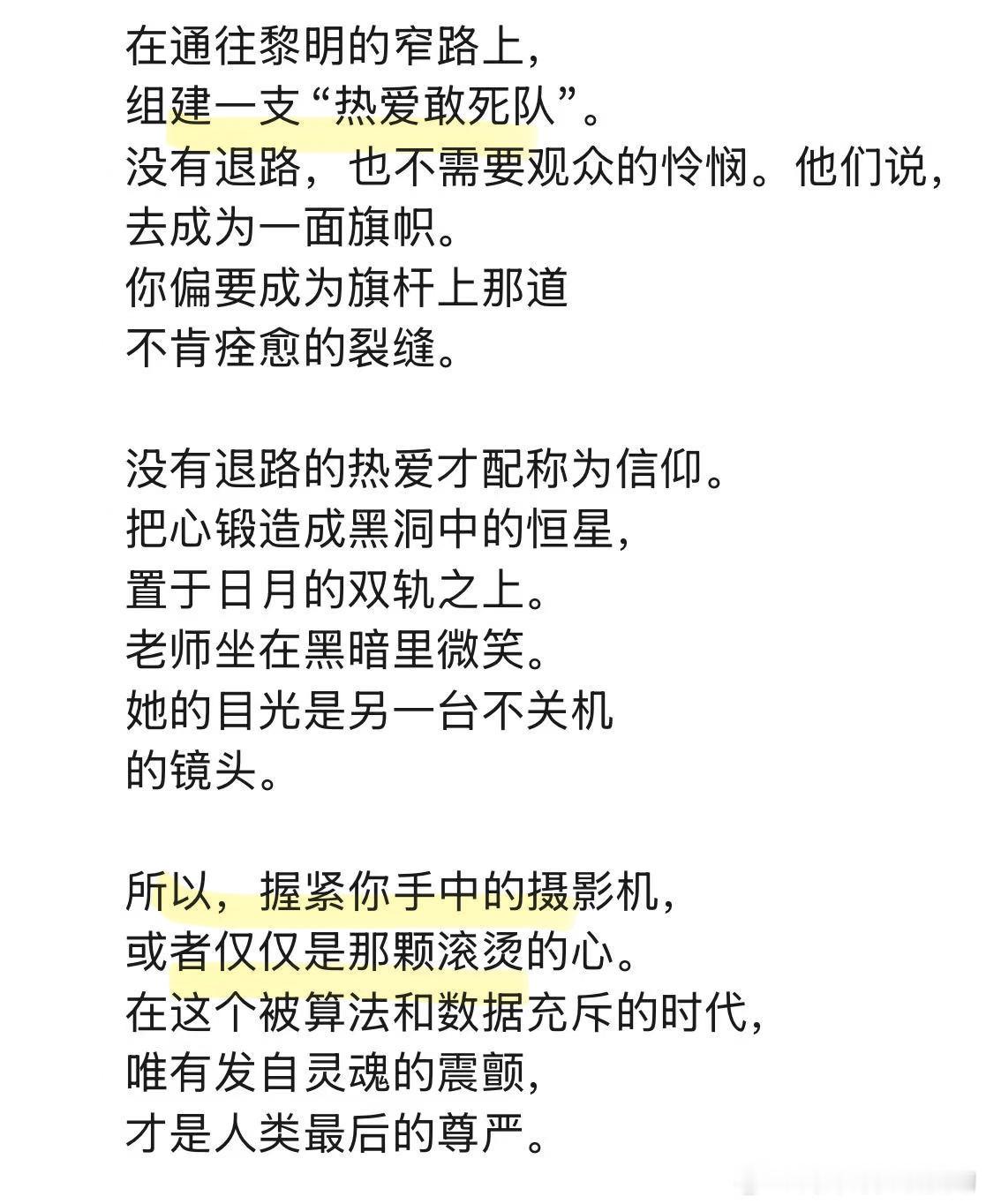 朋友圈有位电影学者,给陈思诚导演写了首诗,老辈子们表达情感还是用这么老派的方式 🚬诗叫《光与影的证明》,顺着读下来,里面说的东西还挺有意思的。“影是光第一次学会站立时跌落的拐杖。”“影,是光的孪生兄弟。”正好赶上电影诞生130周年,电影从诞生之初就是光与影的魔术,1895年的今天,卢米埃尔兄弟在巴黎大咖啡馆地下室第一次放映《火车进站》《工厂大门》《水浇园丁》的时候没有想象过,如今的电影变得越来越魔术。后面还有两段。“你以为你在看世界?不,世界是一面巨大的镜子。”“在通往黎明的窄路上,组建一支‘热爱敢死队’没有退路,也不需要观众的怜悯。”就,挺妙的,通篇都没在说很特定的作品,倒像是在说某种很根本的创作状态,你要在黑暗里给光找形状,还得把自己拆开看看是什么材料,你要往前走,不用太担心,时间会给予评价。以及在这个所有事物都可以被量化的世界里,那份没法被计算的、属于人心底情绪的“震颤”,或许才是真正能留下印记的东西,陈思诚其实也是个妙人了,拍了很多电影做了很多尝试,如今也留下了很多观众喜欢的东西,但还一直在探索表达的新路径,作为电影人来说他是优秀的。看多了太多宣传的通稿,第一次见到这种用诗来对话的方式,反而觉得老辈子们的真诚,不知道陈导自己看到会怎么想。【对了,能不能有机会问问陈导,“在通往黎明的窄路上,组建一支‘热爱敢死队’”和《10间敢死队》有关吗?😂跨年电影愿