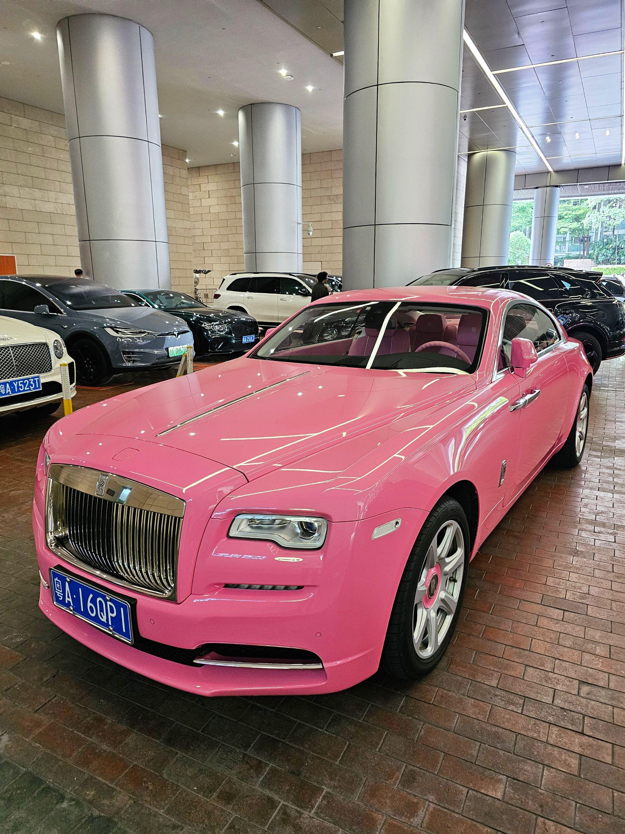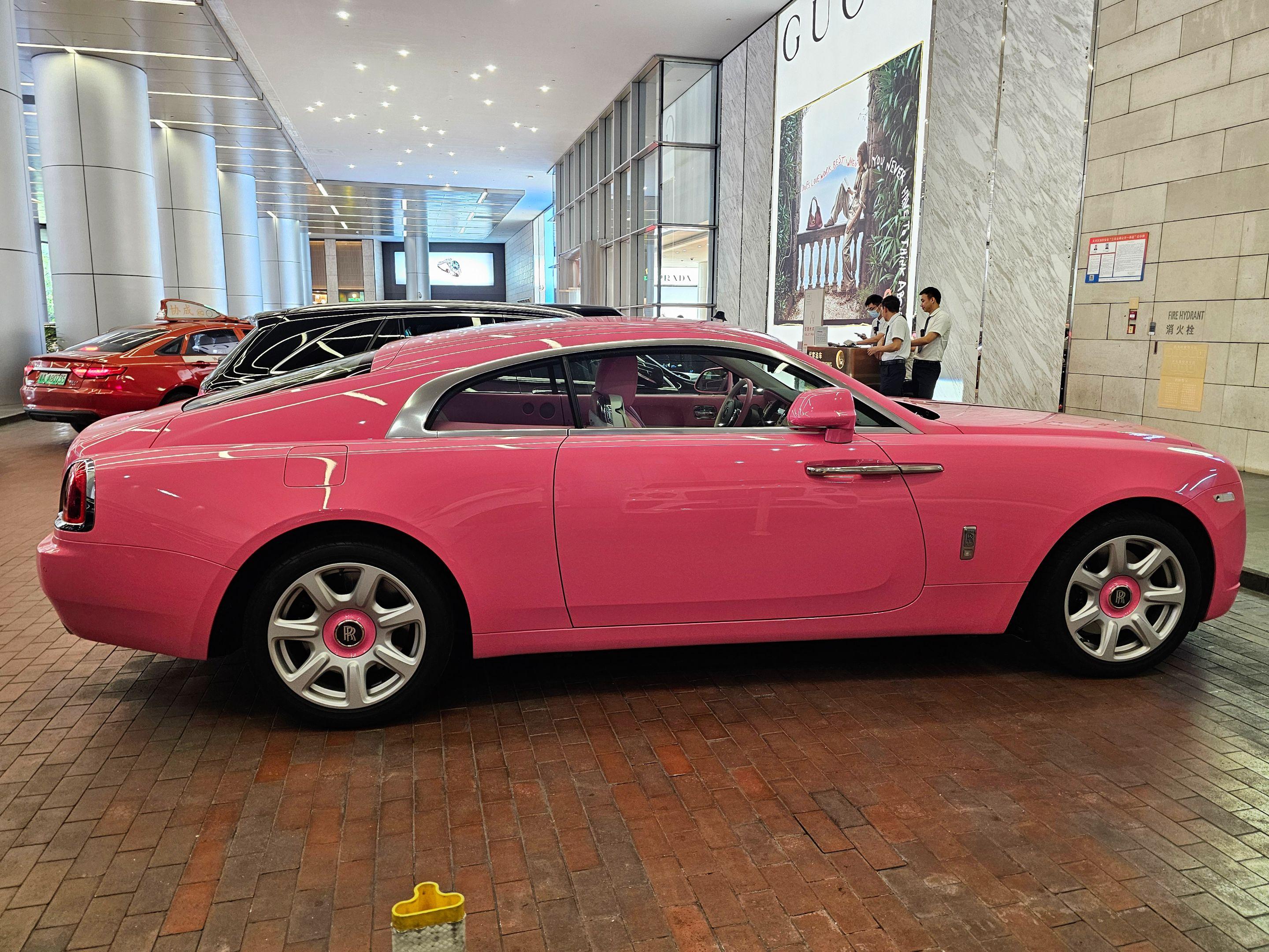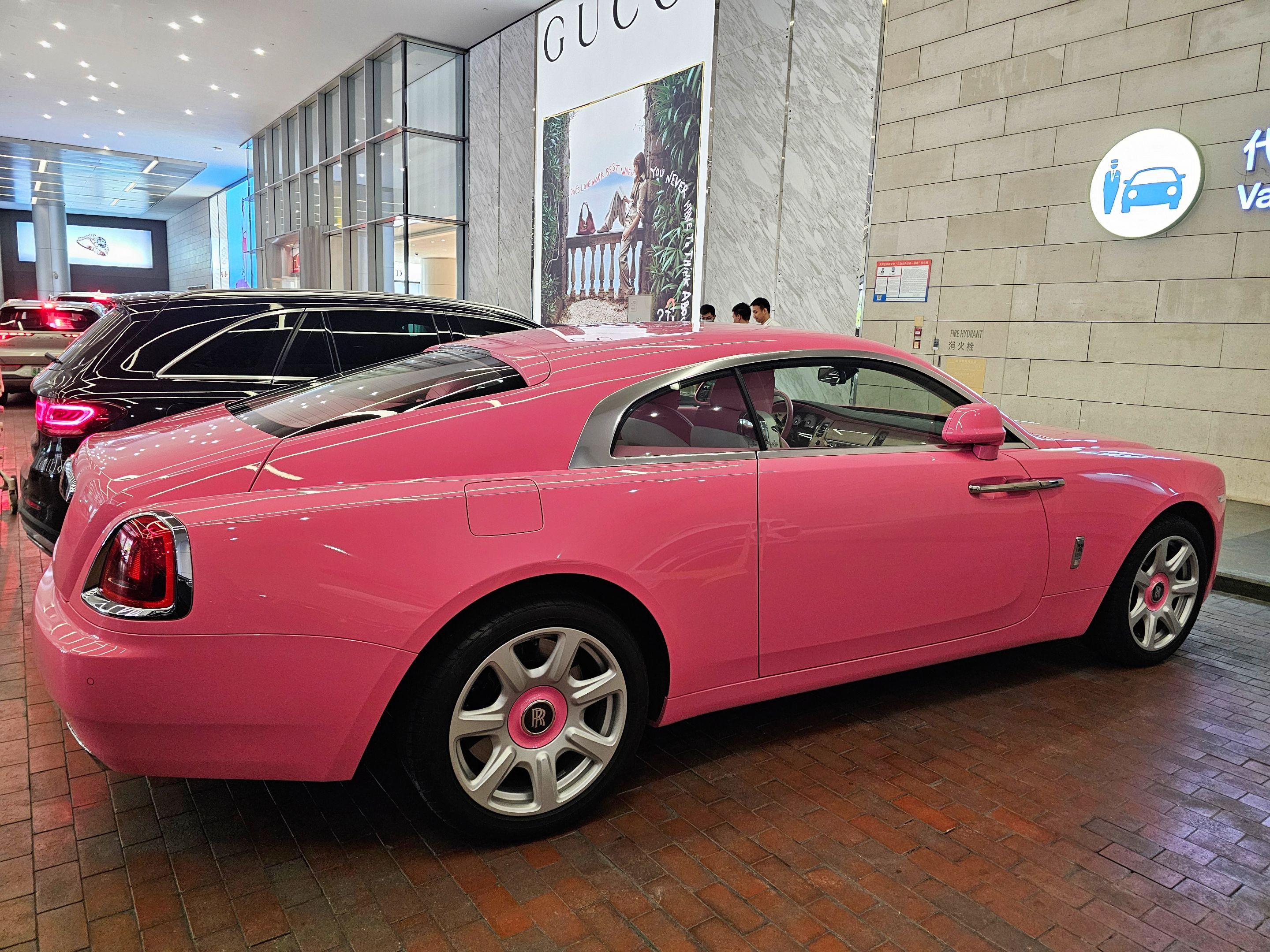 在广州太古汇偶遇富家小姐姐的粉色劳斯莱斯魅影,粉色的外观粉色的内饰座椅...