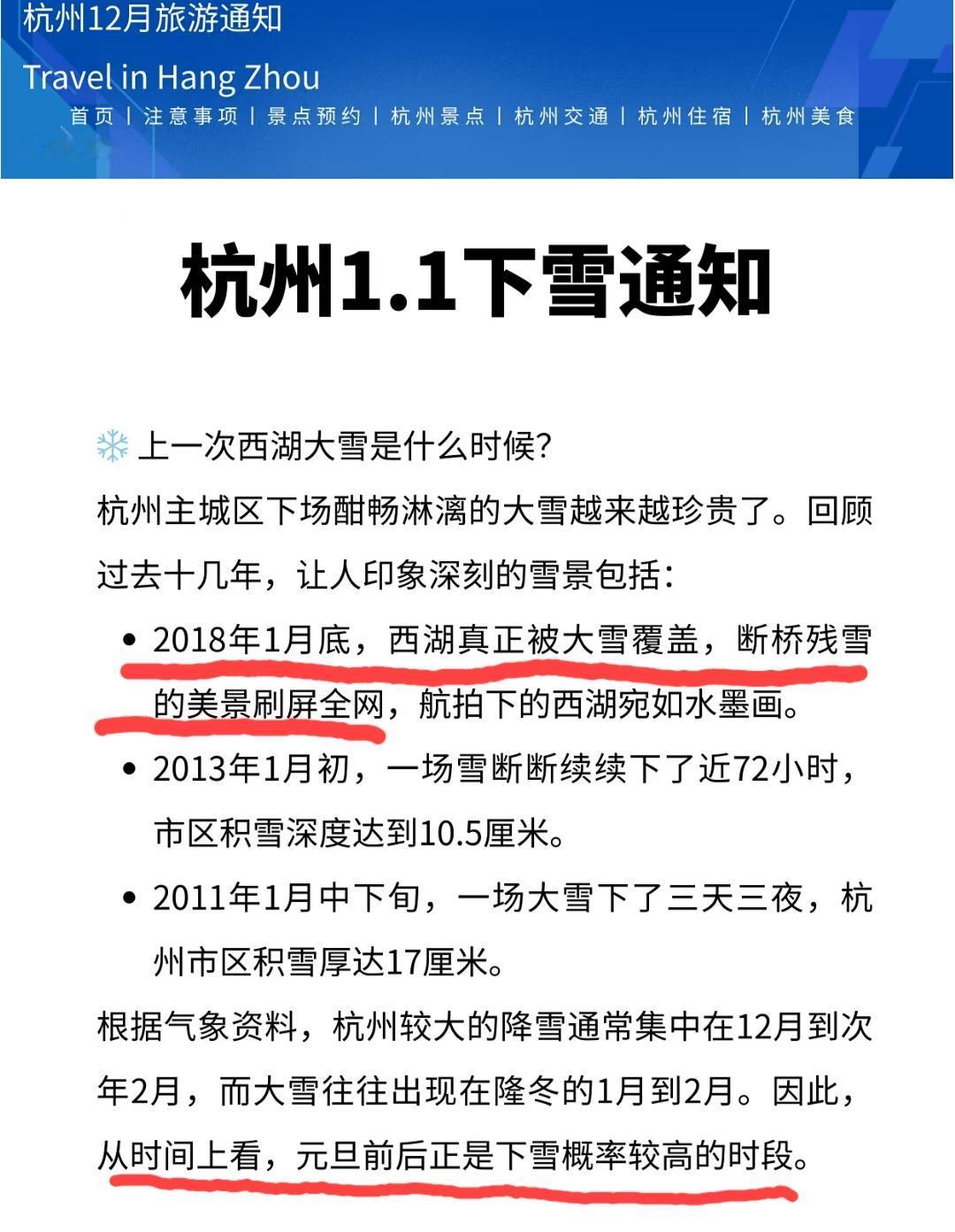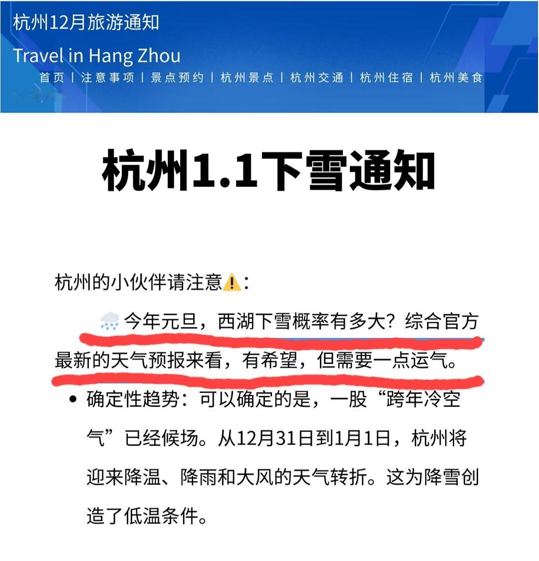 26年元旦,大家一起蹲一场西湖大雪吧? 官方最新的天气预报显示:杭州西湖2026年1月1日当天下雪还是有希望的,但需要一点运气。不过,12月31号到1月1号有一波明显的降温过程是确定的,现在就看这波降温过程是怎么一个强度了。 而上一次西湖1月份下雪,已经是八年前的2018年了。犹记得那一年的西湖景致真的是美轮美奂!!!