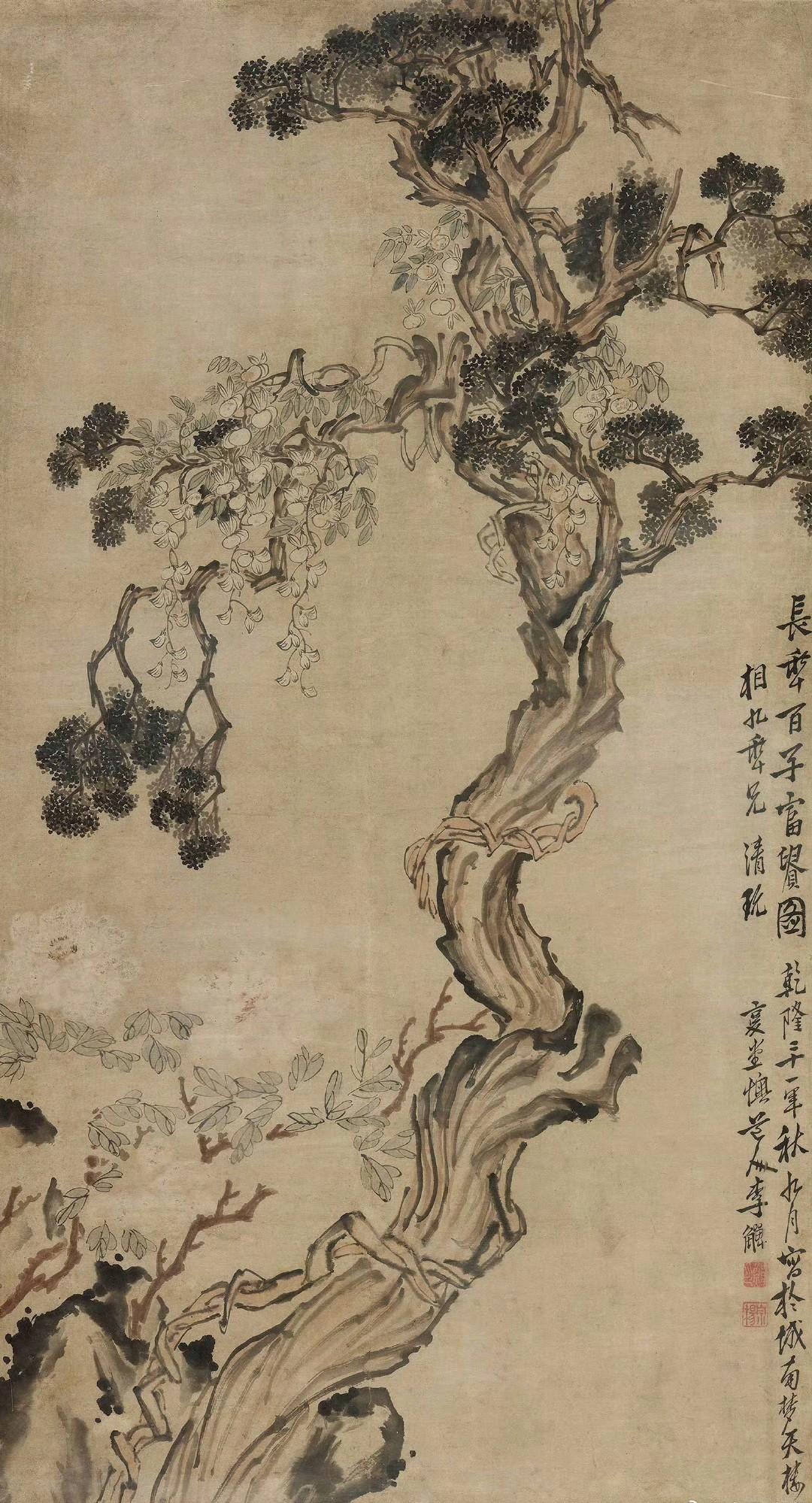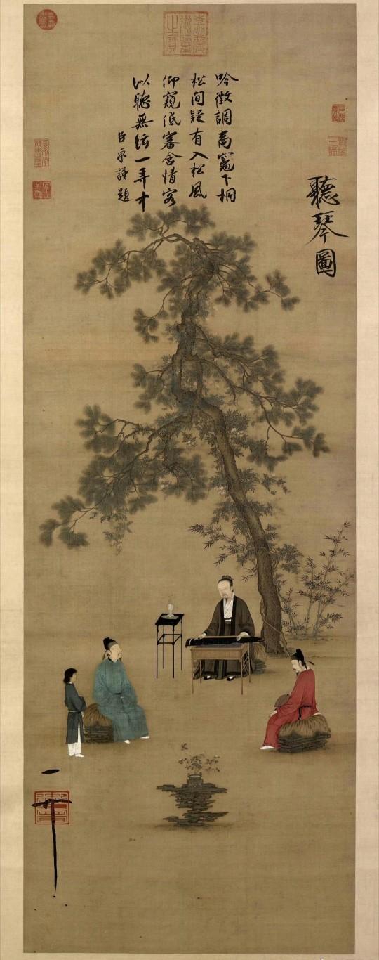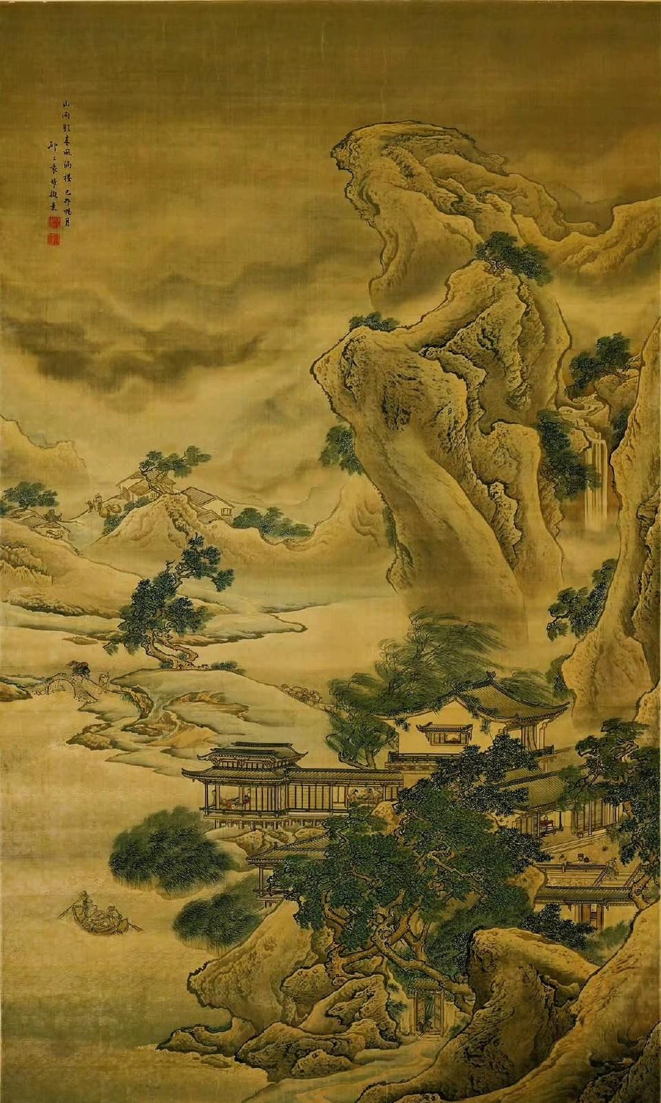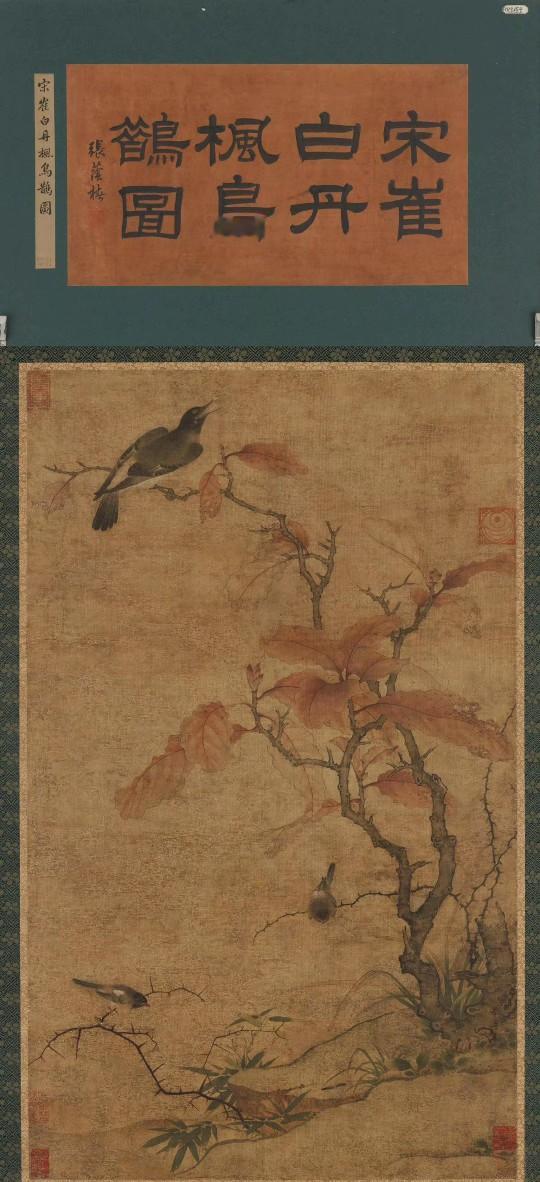 王翚仿王蒙《陡壑奔泉图》。 宋. 崔白《丹枫鸟鹊图》。 北宋.赵佶《听琴图》。 清.袁耀《山雨欲来图》。 吴历的《陶圃松菊图》。 沈云英《乔柯集喜图 》。 清. 李鱓《长年百子富贵图》。 唐寅 《春山伴侣图》。 赵佶 《鸲鹆图》。