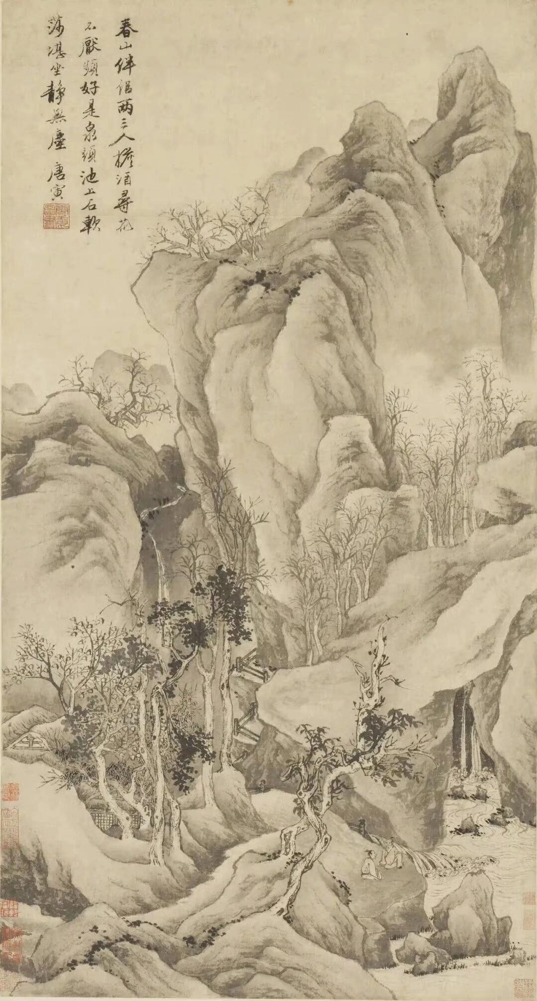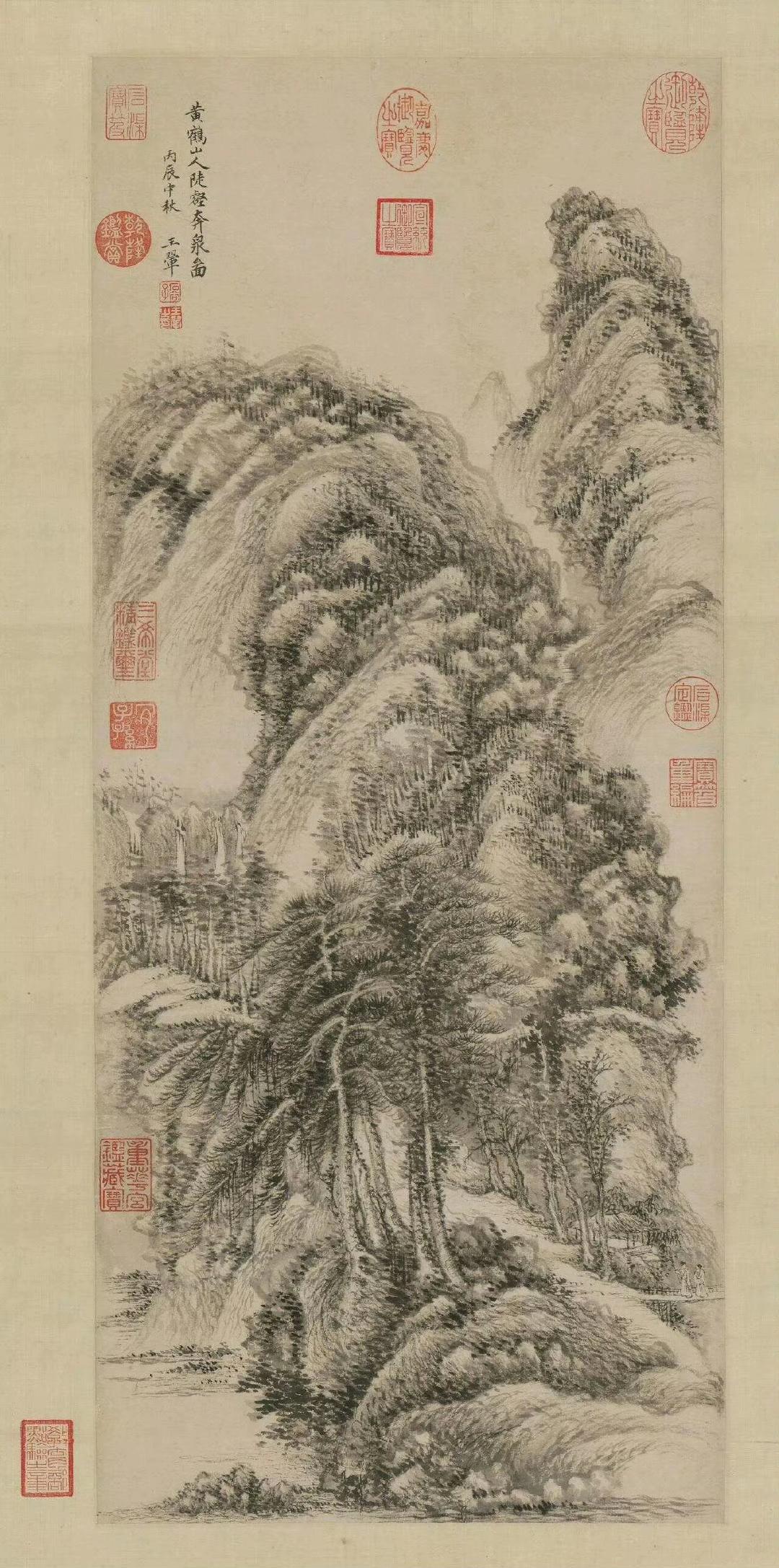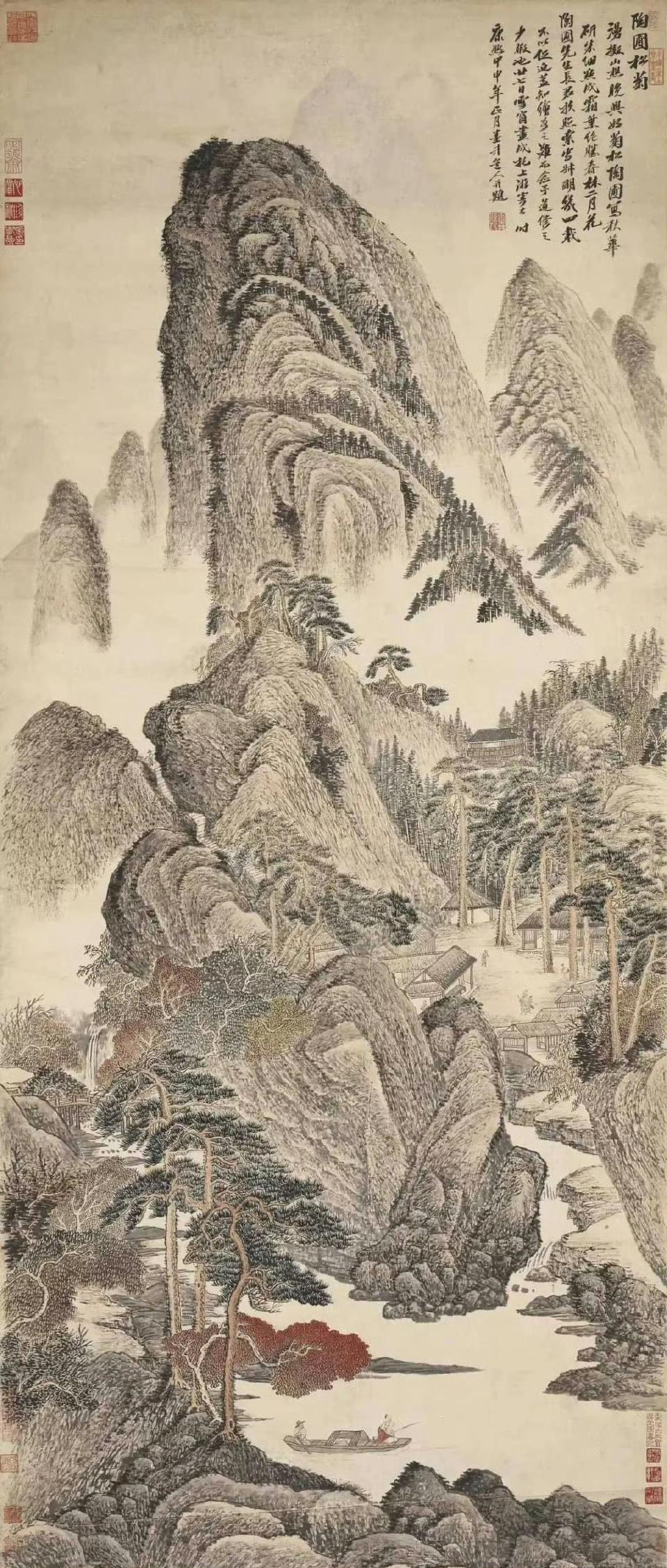 王翚仿王蒙《陡壑奔泉图》。 宋. 崔白《丹枫鸟鹊图》。 北宋.赵佶《听琴图》。 清.袁耀《山雨欲来图》。 吴历的《陶圃松菊图》。 沈云英《乔柯集喜图 》。 清. 李鱓《长年百子富贵图》。 唐寅 《春山伴侣图》。 赵佶 《鸲鹆图》。