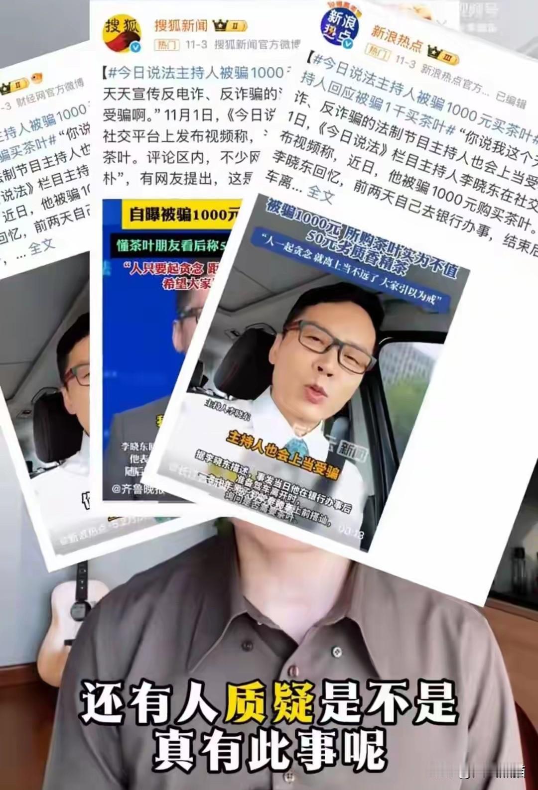 大家要以此为戒 法制栏目的主持人买茶叶竟然被骗了, 事情的起因是这样的,《今日说法》主持人在停车场遭遇“豪车卖茶”骗局,对方开着奔驰,以展销会剩余的高档产品处理为由,花了1000块钱购买五盒茶叶,等到后到家后再发现茶叶相当的劣质。 其实这也不是新鲜的手法了,开着豪车卖保健品,卖酒,卖高档礼盒等等也早就被曝光过,这些人就是通过把自己包装成有钱人,从而降低受害人的戒备心。 经常和法律案件打交道的都被蒙蔽了,可见,这确实是个弱点。 法制节目主持人买茶叶被骗 嫌犯被抓