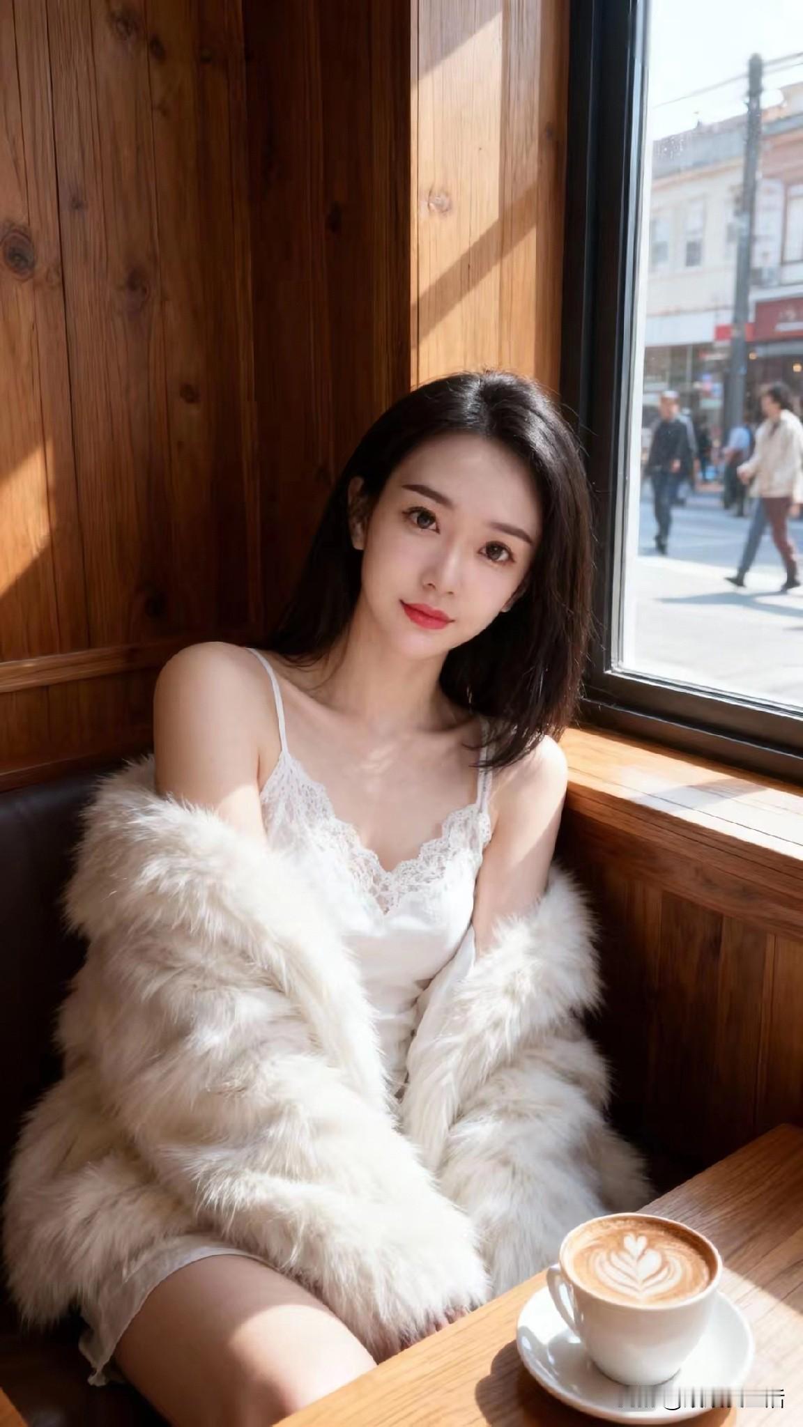 阳光把木格窗裁成金箔 落在她肩头的白绒上 蜷成一团温柔的雪 拿铁的奶泡浮着云朵 勺柄轻碰瓷杯的声响 漫过街道的人潮熙攘 她的目光是未拆的信 隔着玻璃,与风擦肩 咖啡的甜,萦绕在舌尖