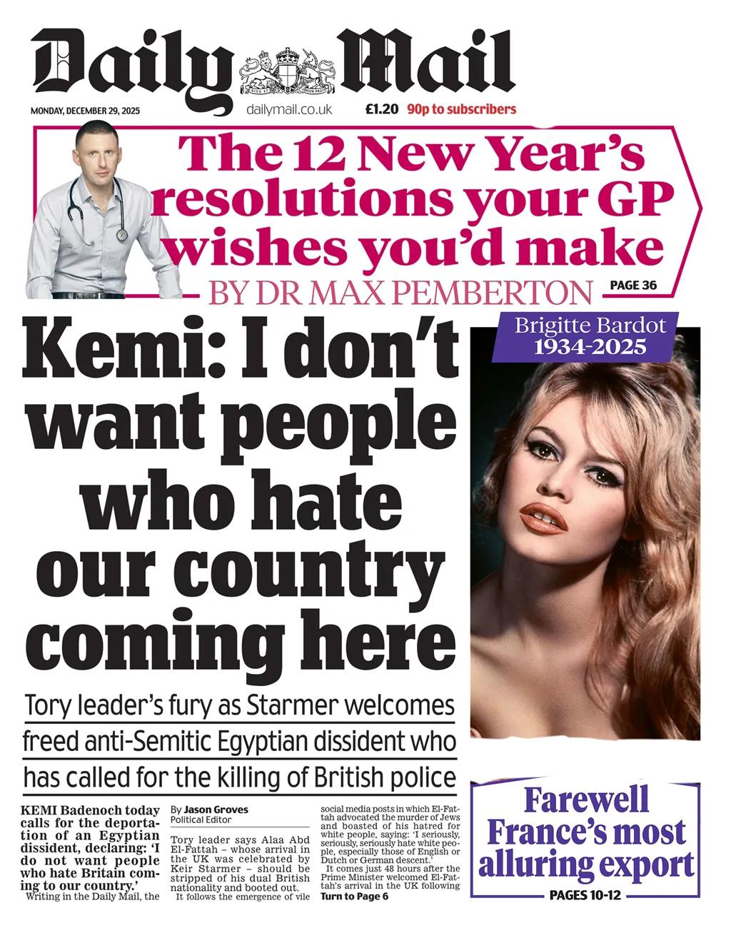 《每日邮报》报道,该报刊登一张法国电影女神碧姬·芭铎性感照片。 2025年12月28日,法国电影女神碧姬·芭铎在法国南部的家中去世,享年91岁。碧姬·芭铎是20世纪最具影响力的银幕偶像之一,被誉为“一代性感女神”,与玛丽莲·梦露齐名。她于1934年9月28日出生在巴黎,早期通过模特工作进入时尚界,随后转向演艺事业。 另外该报关注了,英国保守党领袖凯米·巴德诺赫呼吁将一名埃及异见人士驱逐出英国,此前社交媒体上出现了他似乎呼吁对犹太复国主义者施暴的帖子,