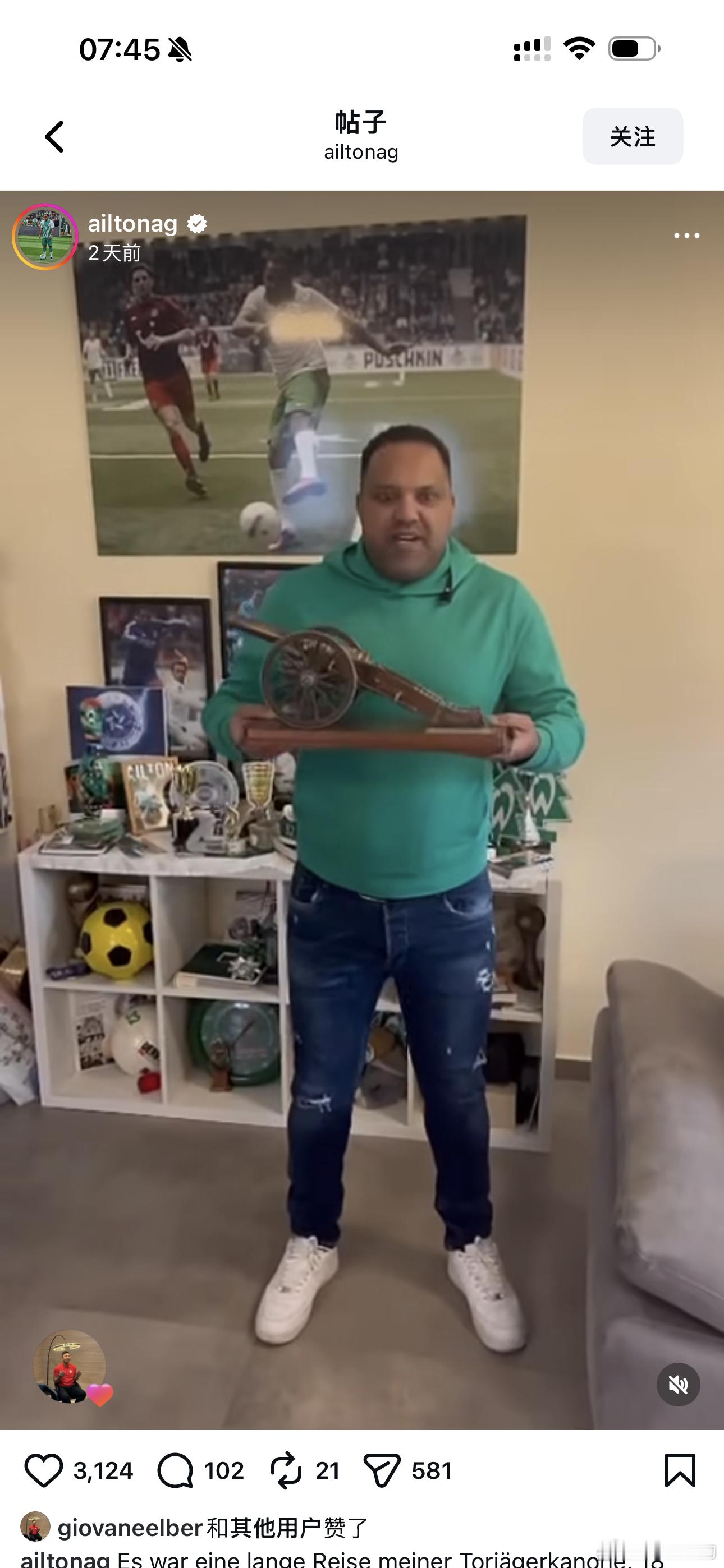 2003-04赛季,不来梅前锋艾尔顿以28个进球获得德甲金靴,并且帮助球队成就双冠王。但是在2006年,因为艾尔顿欠自己的钱,经纪人扣下他的小钢炮,此后多次尝试在ebay上拍卖,但是被艾尔顿阻止,据说当时最高出价都已经到60万欧元。如今艾尔顿突然展示了自己重新拿到小钢炮的照片,他解释说这些年小钢炮又到了另一个经纪人手里,艾尔顿同样和他也有官司,最终庭上和解,艾尔顿出了一笔钱拿回小钢炮。