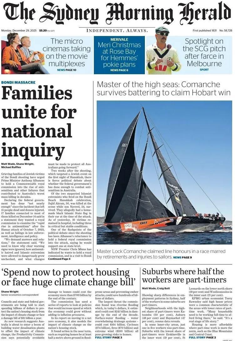 《悉尼先驱晨报》头版报道称,邦迪海滩惨案中家属联合起来要求进行澳大利亚全国调查。 邦迪枪击案中犹太受害者的悲痛家属敦促总理安东尼·阿尔巴尼斯对反犹主义抬头以及导致澳大利亚数十年来最严重大规模杀戮事件的其他失误展开联邦皇家调查委员会调查。 自造成15人死亡、数十人受伤的事件发生以来,这些家属宣称联邦政府做得“远远不够”。与12月14日大多数遇难者有关联的17个家庭在一份声明中表示,他们希望皇家调查委员会调查2023年10月7日哈马斯袭击事件后“反犹主义的迅速抬头”,以及执法、情报和政策方面的失误。 这份声明称:“我们要求得到答案和解决方案。我们需要知道为何明显的警告信号被忽视,反犹仇恨和伊斯兰极端主义是如何被放任危险地不受控制地增长的,以及需要做出哪些改变。” 必须采取措施保护所有澳大利亚人,确保未来的安全。 枪击事件发生两周后,这场针对光明节首日犹太活动的袭击引发了激烈的政治辩论,焦点在于联邦政府在打击澳大利亚反犹主义方面是否做得足够。 在邦迪海滩光明节庆祝活动中开枪的两名疑似伊斯兰极端分子中,50岁的萨吉德·阿克拉姆在现场被击毙,而他24岁的儿子纳维德幸存。 据称,袭击发生时他们车上有一面自制的黑色伊斯兰国旗帜。截至昨日,仍有10名受害者住院,其中3人情况危急但稳定。 枪击事件后政治辩论的一个焦点是阿尔巴尼斯不愿就此次袭击举行联邦皇家委员会调查,他表示会支持在州一级进行调查。 新南威尔士州州长克里斯·明斯表示他希望举行皇家委员会调查。