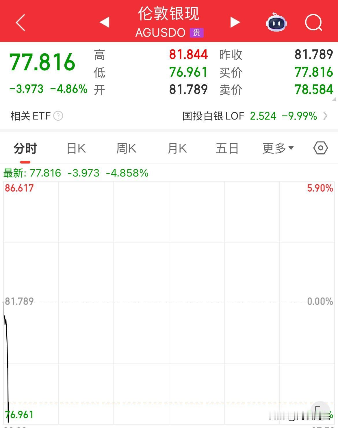 白银暴跌5%,最高81美元,冲高后直接闪崩,现跌幅5%,直接抹去涨幅,冲下76美元,这哥们终于跌了