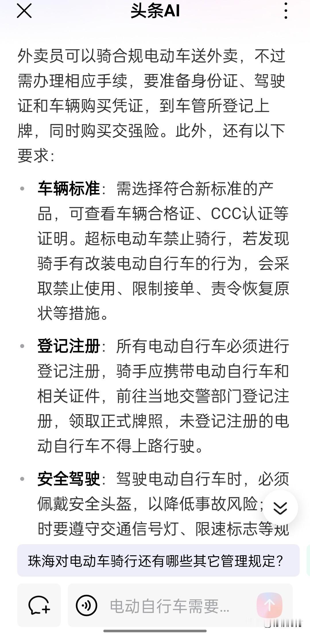 在路上看到珠海铁骑在查电动车,一个盒马配送员的车被扣了,另一个美团的骑手落荒而逃。[笑哭] 问了下头条AI,说是珠海不禁止外卖员骑电动车,但要满足多项要求,比如骑手要注册,符合车辆标准等。还是说电动车新国标开始落地了?